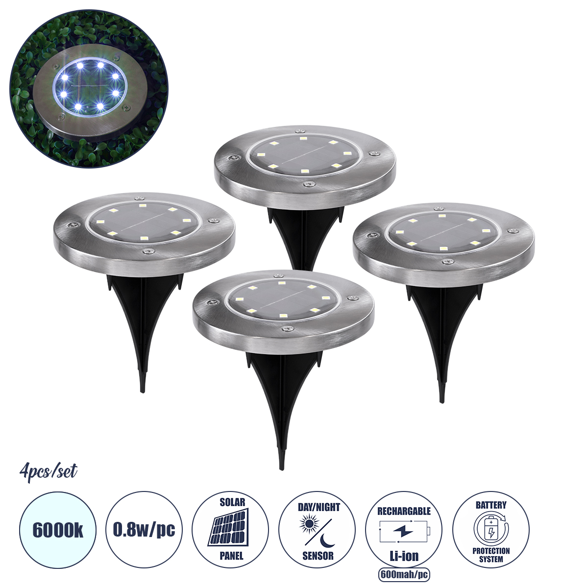 GloboStar® 69929 ΣΕΤ 4 Τεμαχίων Αυτόνομα Ηλιακά Φωτιστικά LED SMD 0.80W/Τεμ. 80lm/Τεμ. με Ενσωματωμένη Μπαταρία 600mAh - Φωτοβολταϊκό Πάνελ με Αισθητήρα Ημέρας-Νύχτας Αδιάβροχο IP65 Φανάρι Κήπου Στρογγυλό Ψυχρό Λευκό 6000K Φ12 x Υ13cm