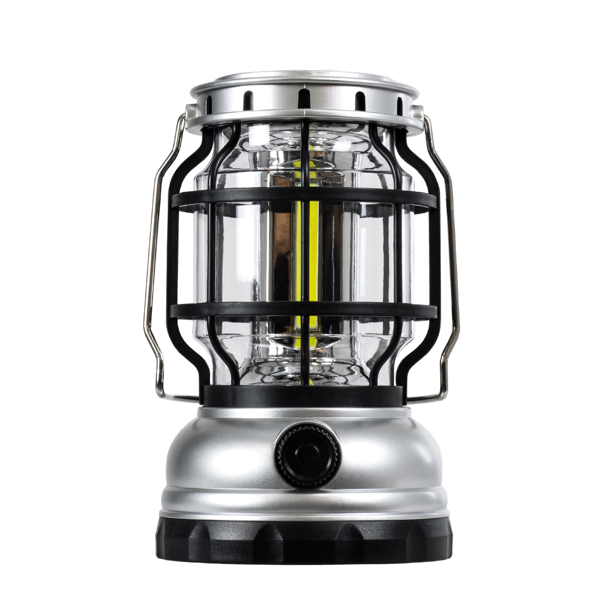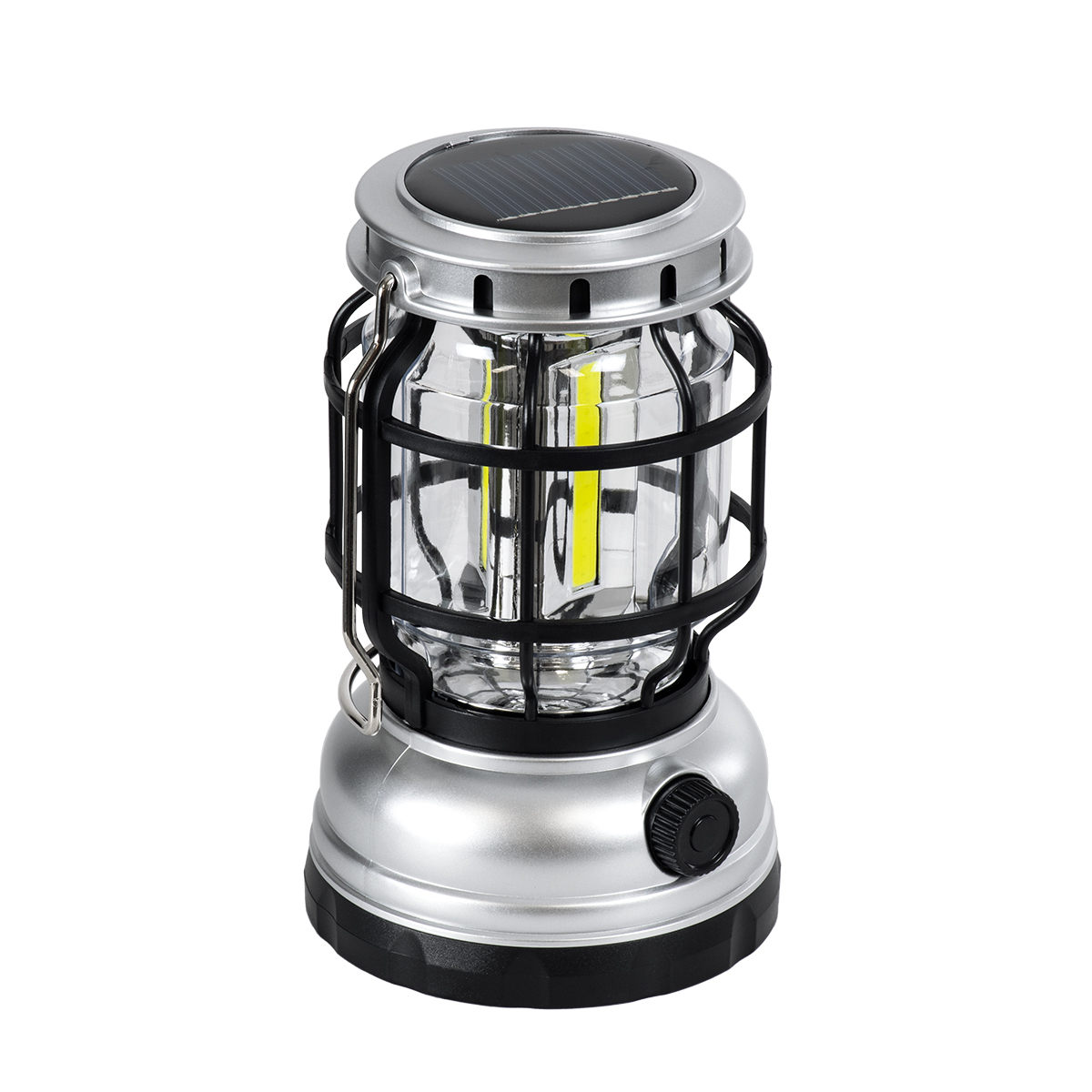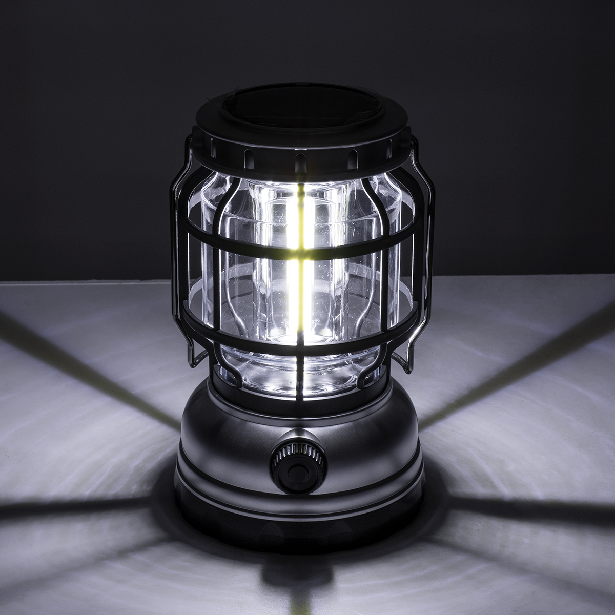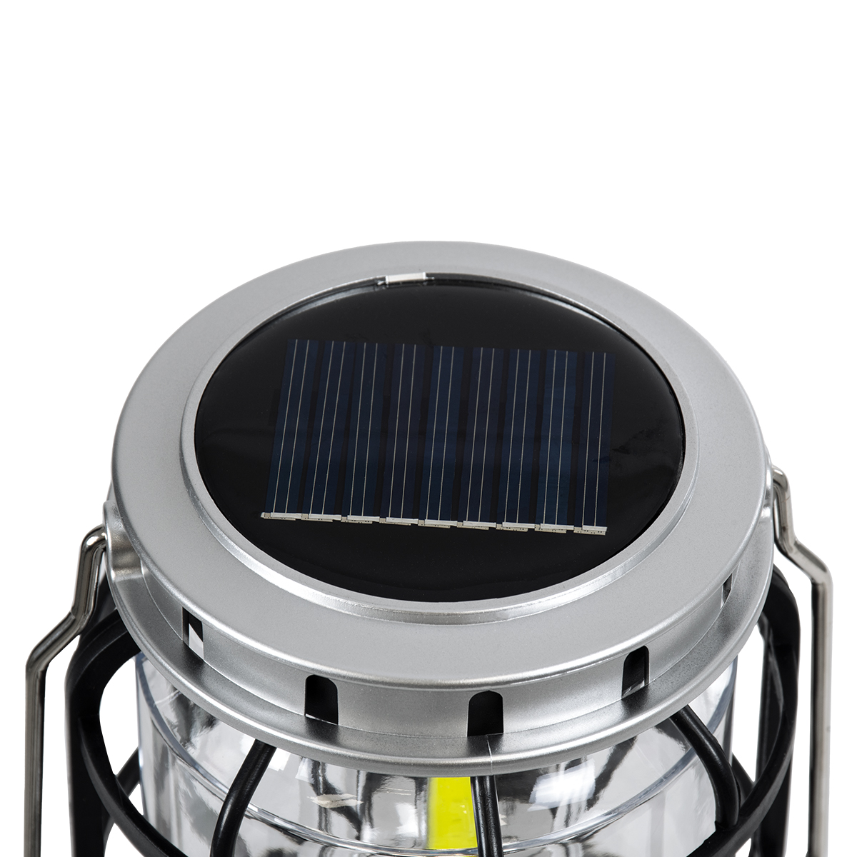 GloboStar® 69932 Αυτόνομο Ηλιακό Επαναφορτιζόμενο Φανάρι Camping LED 5W με Επαναφορτιζόμενη Μπαταρία 18650 1200mAh Li-ion - Power Bank - Αδιάβροχο IP54 - Dimmable - Μαύρο Ασημί - Ψυχρό Λευκό 6000K Φ10.2 x Υ16cm