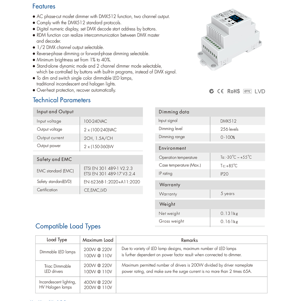 GLOBOSTAR® SKYDANCE-S1-DR 70670 AC Trailing Edge DMX Dimmer Ράγας με 2 x 1.5A 360W Κανάλια AC 220-240V 3A 720W Max IP20 - DMX512 & RDM - Μ11.5 x Π5 x Υ6.5cm - 5 Χρόνια Εγγύηση