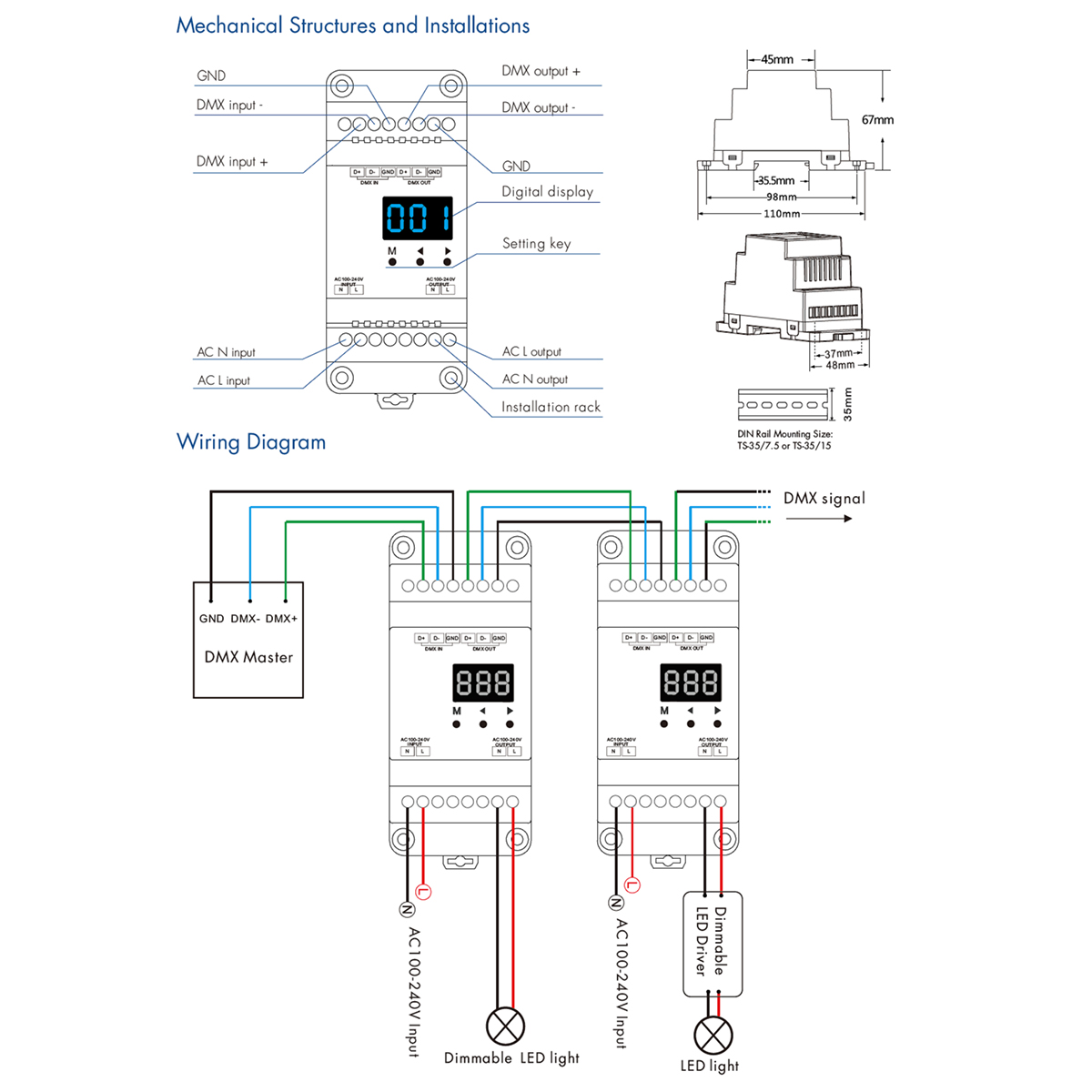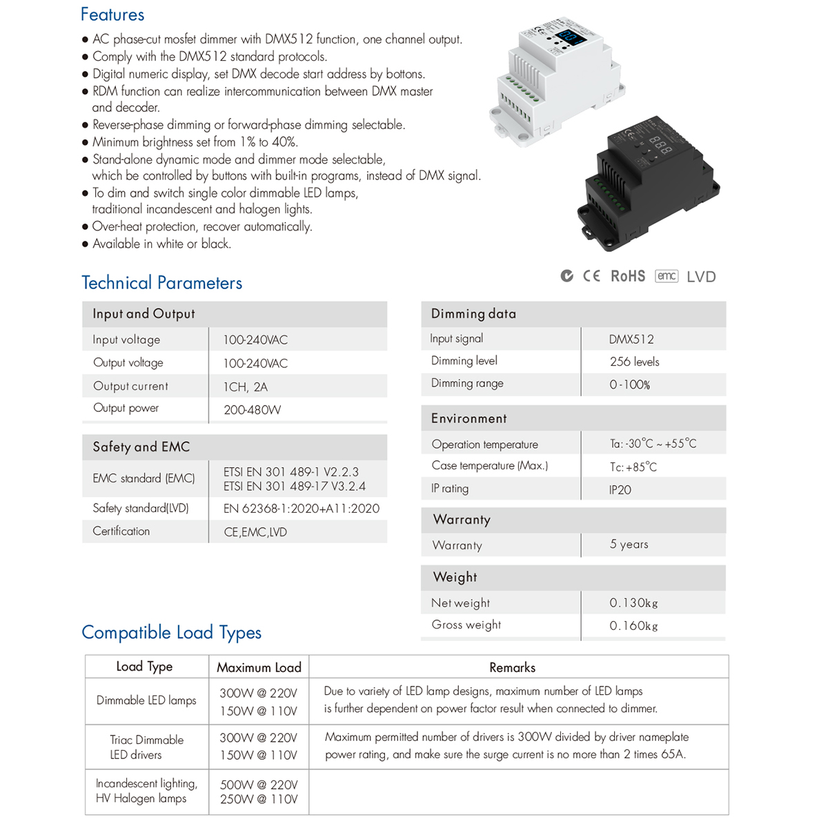GLOBOSTAR® SKYDANCE-S1-D1 70672 AC Trailing Edge DMX Dimmer Ράγας με 1 x 2A 480W Κανάλι AC 220-240V 2A 480W Max IP20 - DMX512 & RDM - Μ11.5 x Π5 x Υ6.5cm - 5 Χρόνια Εγγύηση