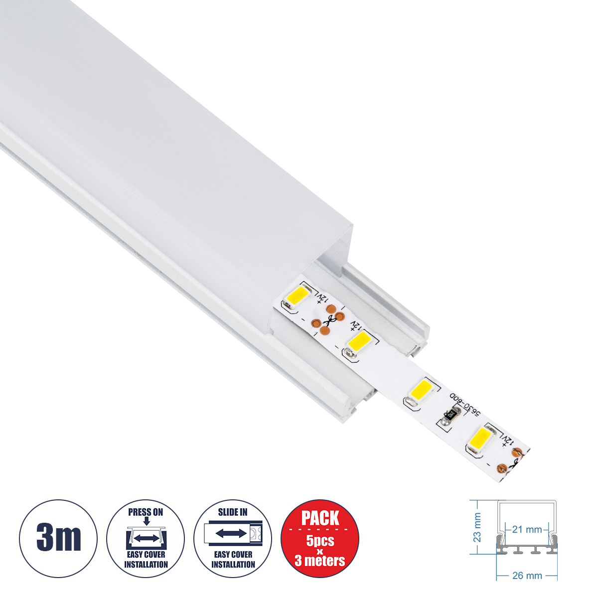 GloboStar® SURFACEPENDANT-PROFILE 70848-3M Προφίλ Αλουμινίου - Βάση & Ψύκτρα Ταινίας LED με Λευκό Γαλακτερό Κάλυμμα - Επιφανειακή & Κρεμαστή Χρήση - Πατητό Κάλυμμα - Λευκό - 3 Μέτρα - Πακέτο 5 Τεμαχίων - Μ300 x Π2.6 x Υ2.3cm