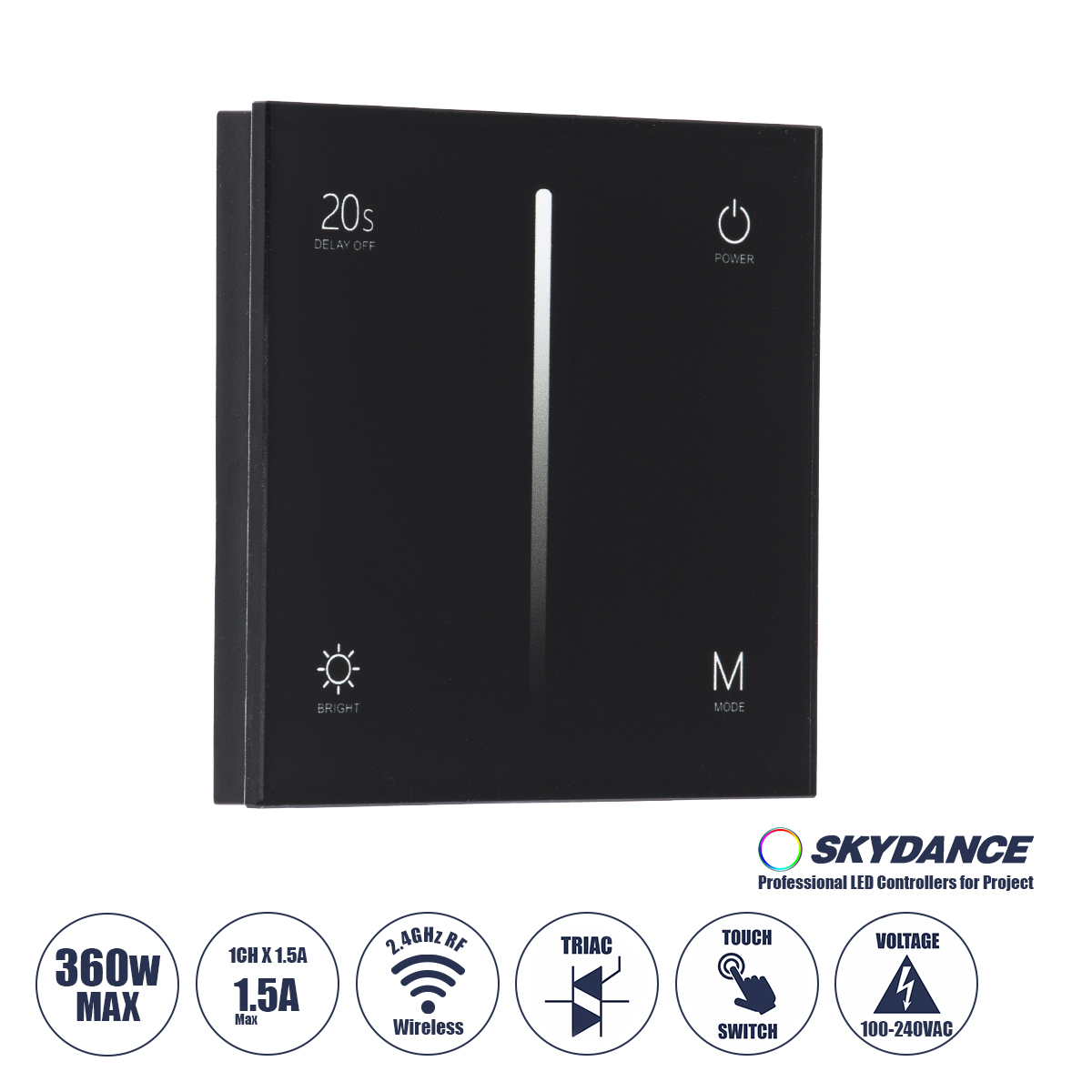 GloboStar® 71453 S1-T SKYDANCE AC Smart RF 2.4Ghz & Αφής - Touch Triac Dimming AC100-240V σε AC100-240V 1 x 1.5A 360W - Max 1.5A 360W - IP20 - Μαύρο Σώμα - Μ8.5 x Π8.5 x Υ3.2cm - 5 Years Warranty