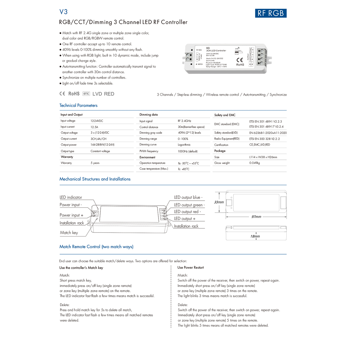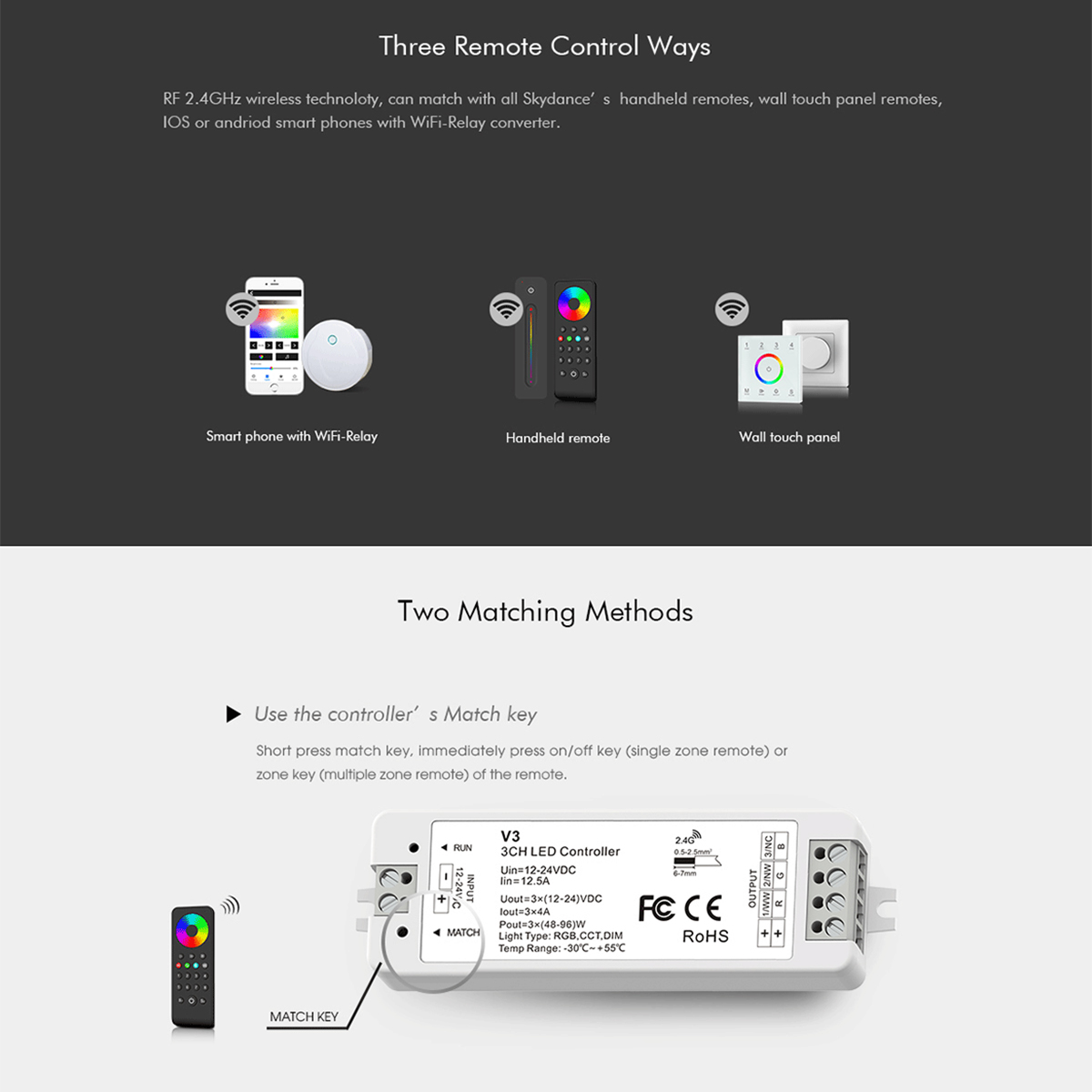 GloboStar® 71546 V3 SKYDANCE DC RF 2.4Ghz Dimmer High Speed Controller 3 Καναλιών DC 12-24V 3 x 5A 96W - Max 12A 288W - IP20 Μ10 x Π3.5 x Υ2cm - 5 Years Warranty
