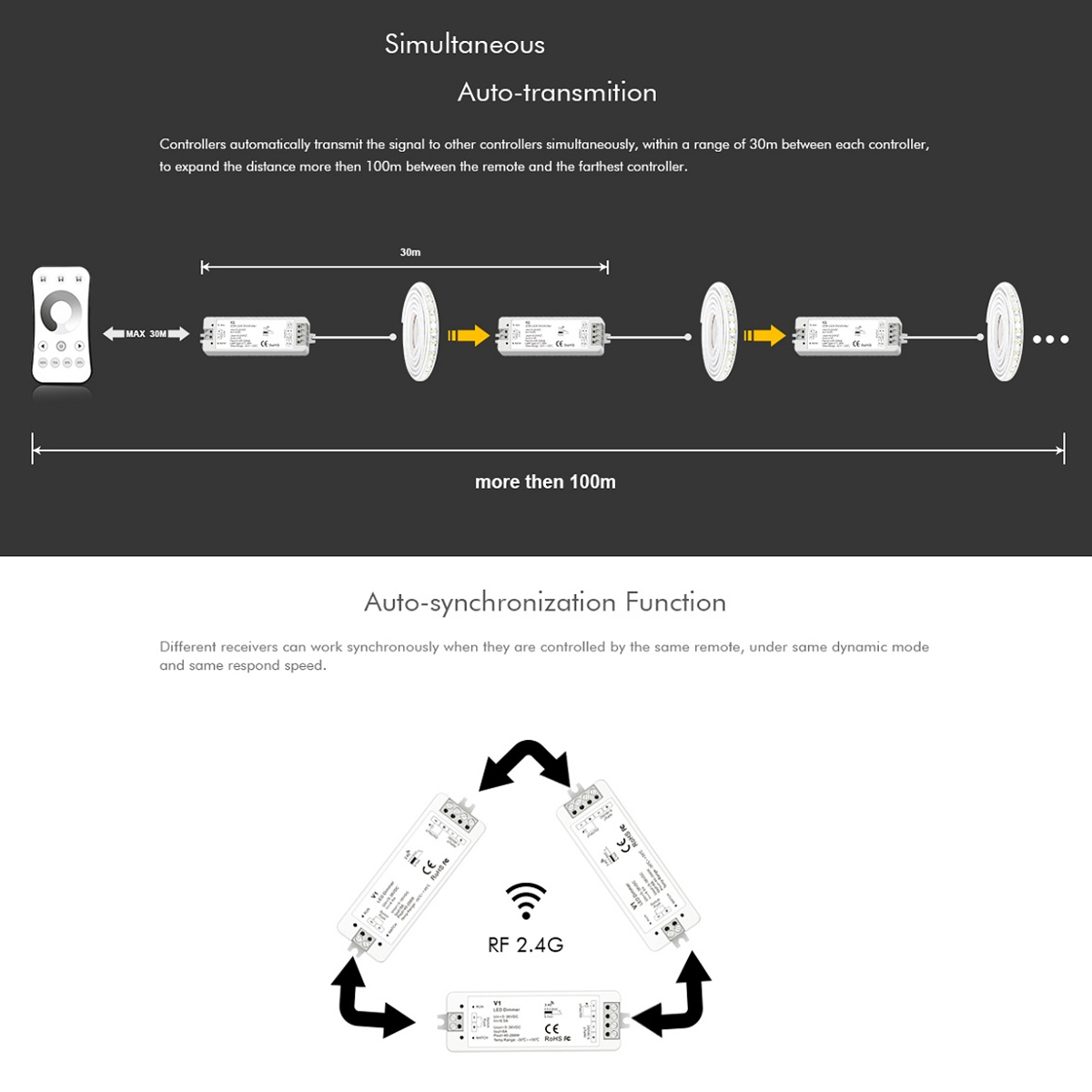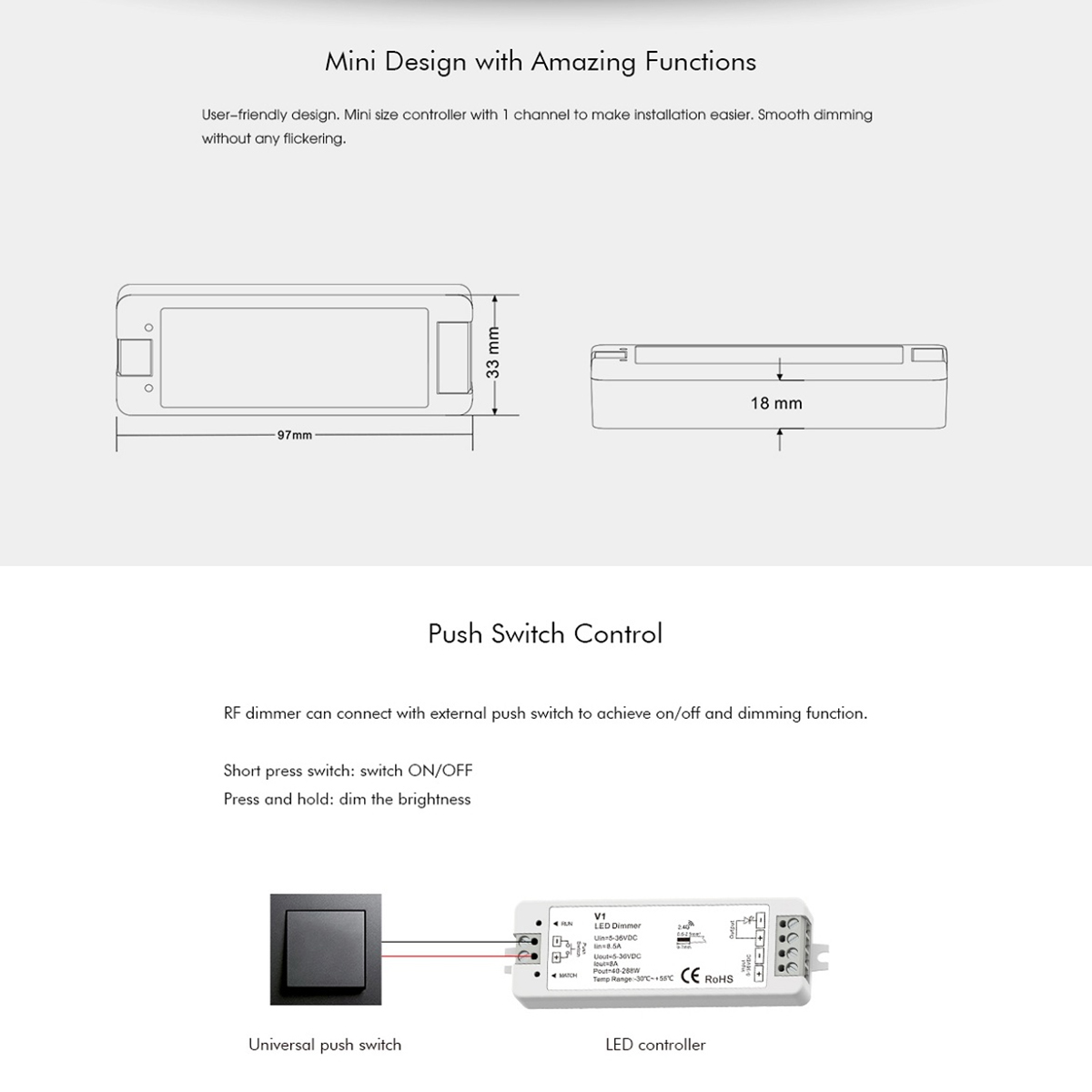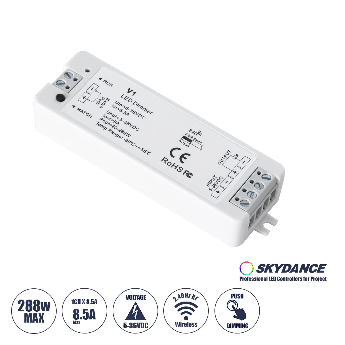 GLOBOSTAR® SKYDANCE-V1 71567 DC RF 2.4Ghz & Push Dimmer / Controller με 1 x 8A 288W Κανάλι DC 5-36V 8A 288W Max IP20 - RF 2.4Ghz & Push Dimming - Μ10 x Π3.5 x Υ2cm - 5 Χρόνια Εγγύηση