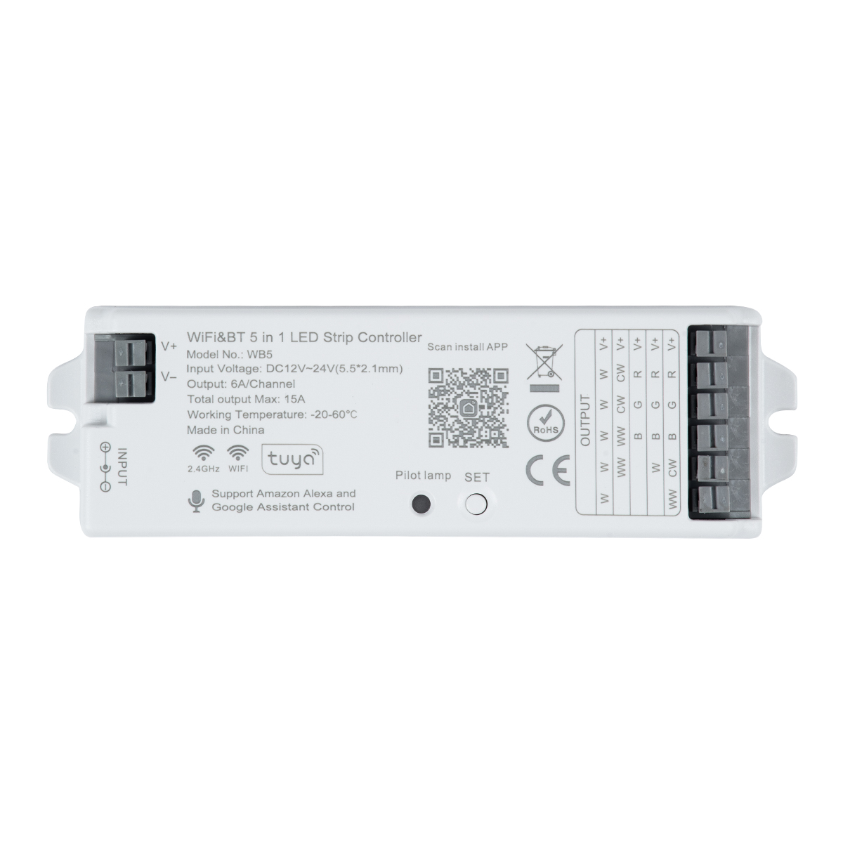 GLOBOSTAR® TUYA-WB5 73008 DC WiFi & Bluetooth Master Dimmer / Controller Υψηλής Ταχύτητας με 5 x 6A 72W Κανάλια DC 12-24V 15A 360W Max IP20 - WiFi & Bluetooth - Μ12.2 x Π3.8 x Υ2.2cm - 5 Χρόνια Εγγύηση