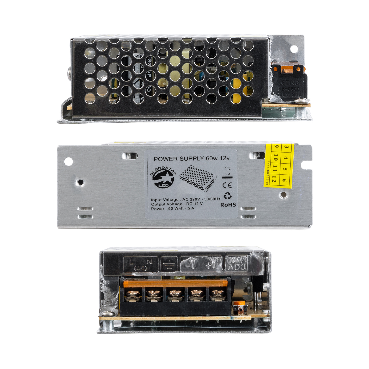 GloboStar® 73033 Μεταλλικό Τροφοδοτικό PELV για Προϊόντα LED 60W 5A - AC 220-240V σε DC 12V - IP20 - Μ11 x Π8 x Υ3.5cm - 2 Χρόνια Εγγύηση