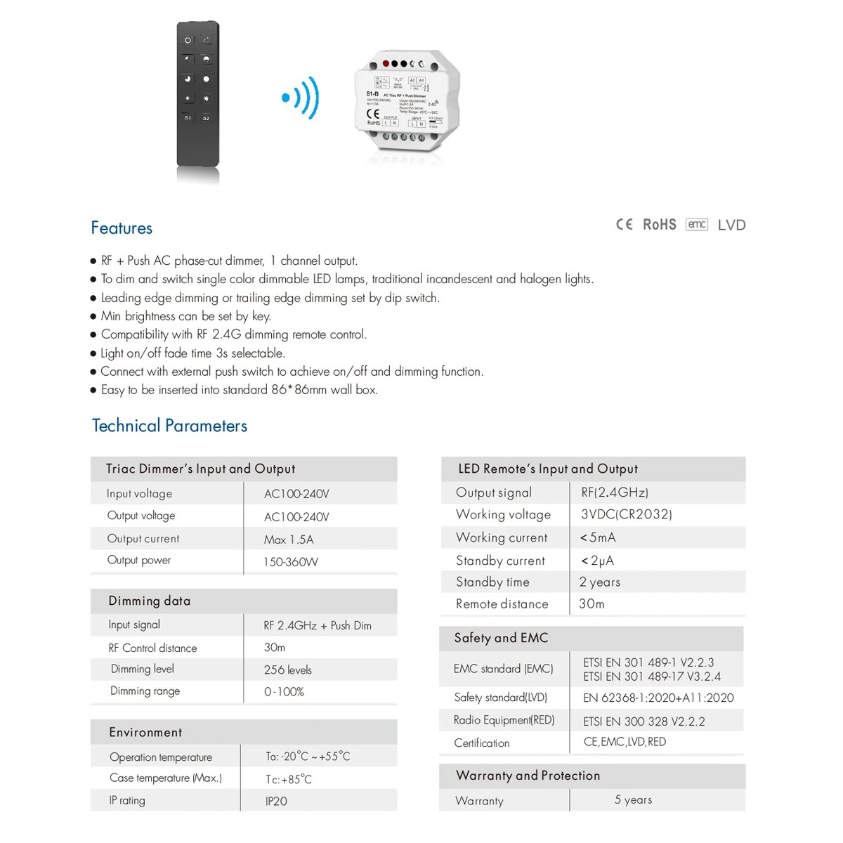 GloboStar® 73125 S1-B+R1 SKYDANCE ΣΕΤ Dimmer & Ασύρματο Χειριστήριο Αφής 1 Group RF 2.4Ghz 1.5A Max AC100-240V (360W) - DC 3V IP20 - 5 Χρόνια Εγγύηση