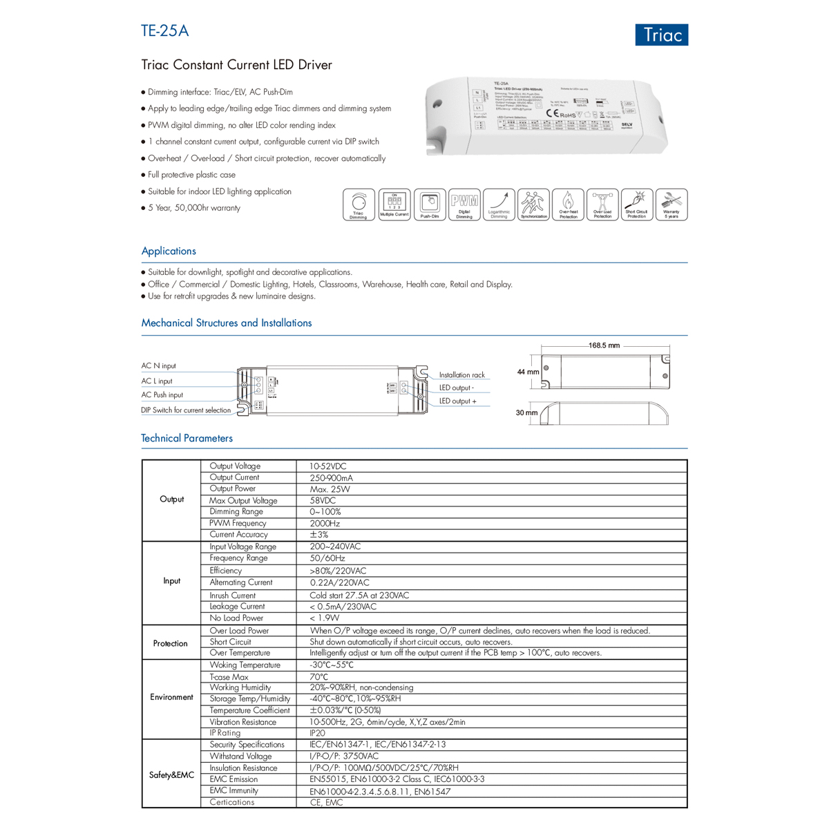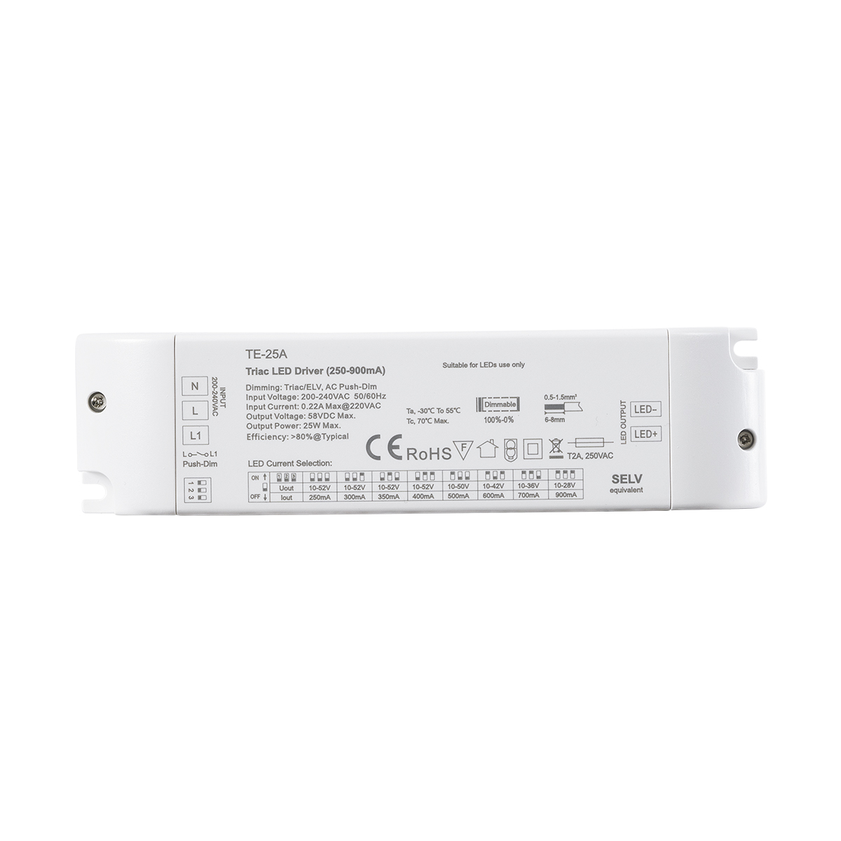 GLOBOSTAR® SKYDANCE-TE-25A 73134 DC Triac & Push Dimmer CC Τροφοδοτικό/Μετασχηματιστής SELV με 1 x 250-900mA 25W Κανάλι AC 220-240V σε DC 10-52V 900mA 25W Max IP20 - Triac & Push Dimming - Μ17.5 x Π4.4 x Υ3cm - 5 Χρόνια Εγγύηση