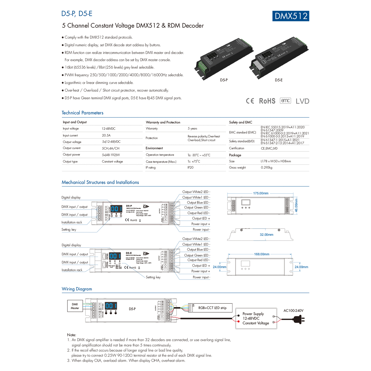 GloboStar® 73148 D5-E SKYDANCE DC DMX512 & RDM Decoder 5 Καναλιών DC 12-48V 5 x 4A 960W - Max 20.5A 960W - IP20 Μ17.5 x Π4.5 x Υ3.3cm - 5 Χρόνια Εγγύηση