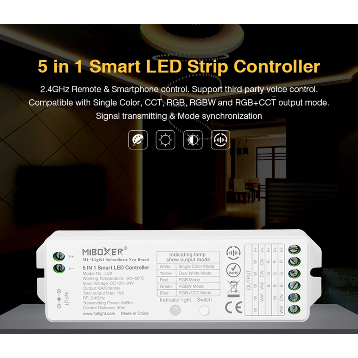 GloboStar® 73422 LS2 Mi-BOXER DC RF 2.4Ghz 5 in 1 Dimmer High Speed Controller / Dimmer 5 Καναλιών DC 12-24V 5 x 3A 72W - Max 15A 360W - IP20 RGBW+WW Μ13 x Π5 x Υ2.5cm - 5 Years Warranty