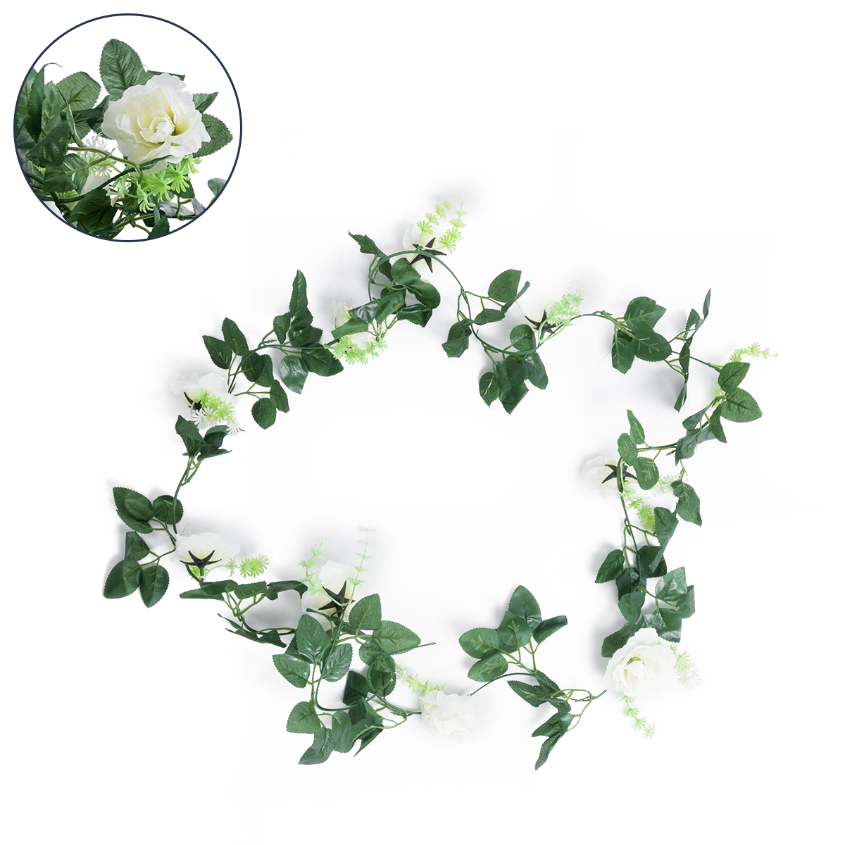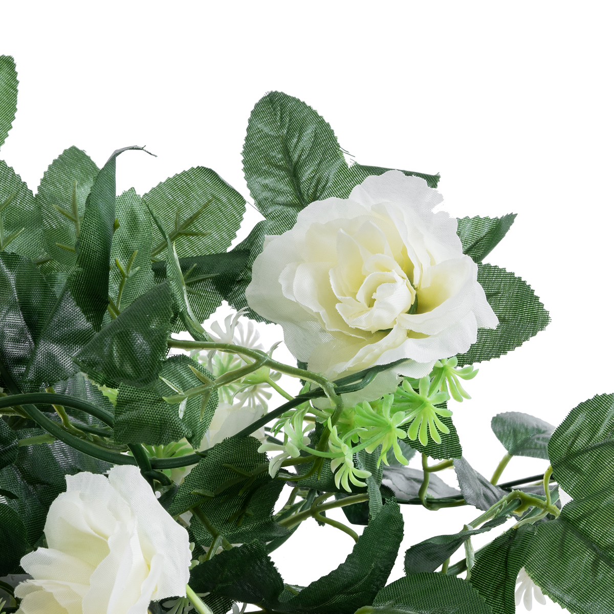 GloboStar® 78131 Τεχνητό Κρεμαστό Φυτό Διακοσμητική Γιρλάντα Λουλουδιών με 10 Λευκά Τριαντάφυλλα & Πράσινο Φύλλωμα Μ12 x Π12 x Υ220cm