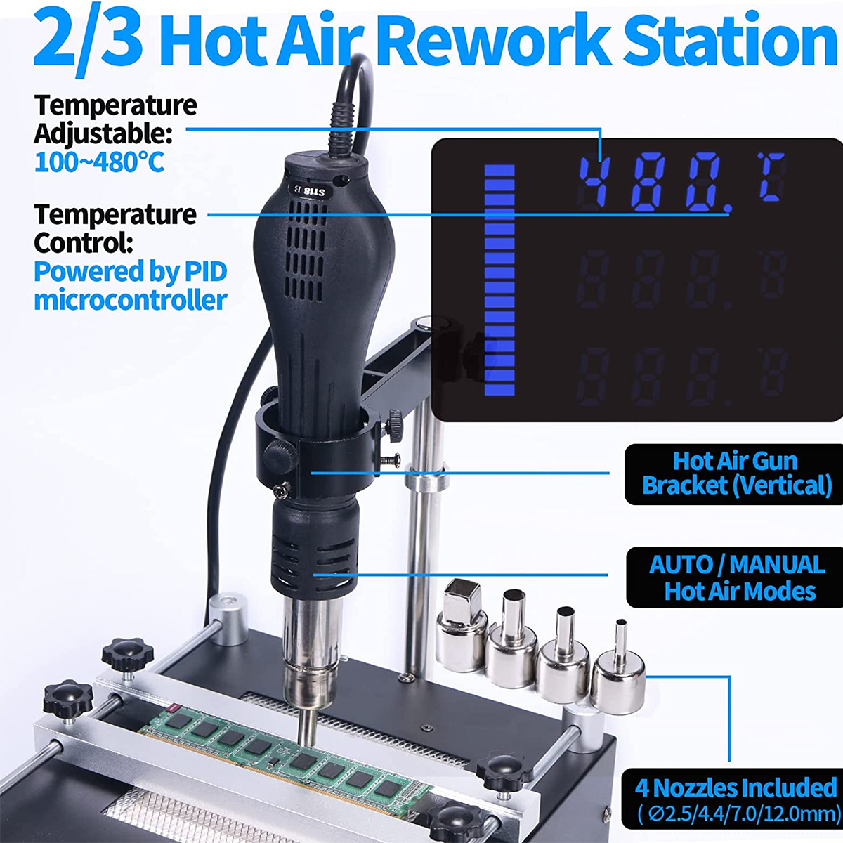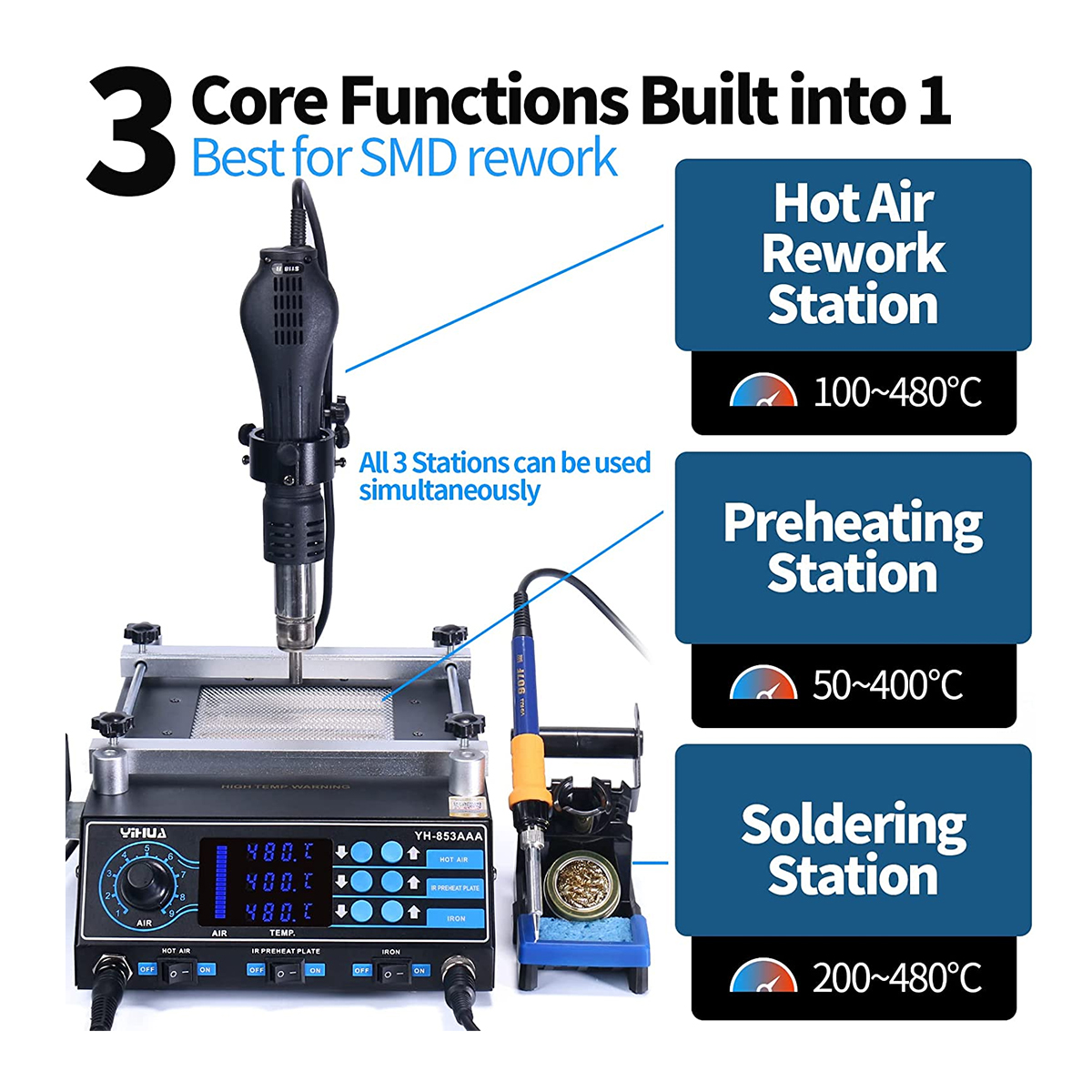 GloboStar® 79973 Ψηφιακός Σταθμός Συγκόλλησης 3in1 με Ψηφιακή Οθόνη - Κολλητήρι - Πιστόλι Θερμού Αέρα Hot Air Soldering Welding Gun - Φούρνος Πλακετών Solder Preheat Welding Oven PCB και PID Προγραμματιζόμενο Σύστημα Ελέγχου Θερμοκρασίας - 1200W