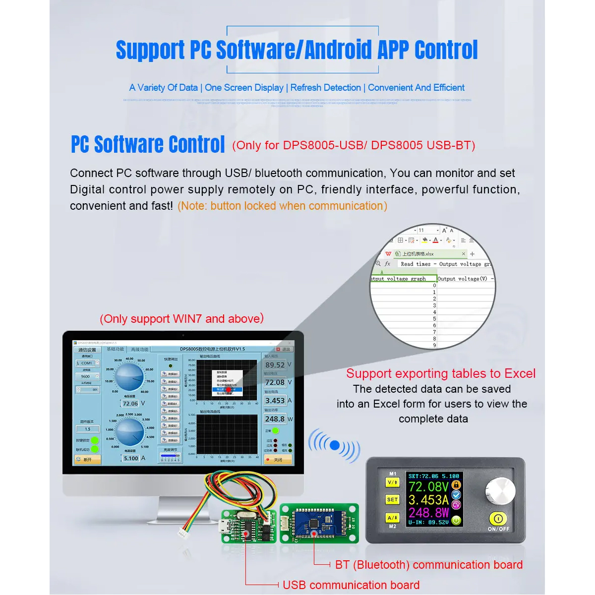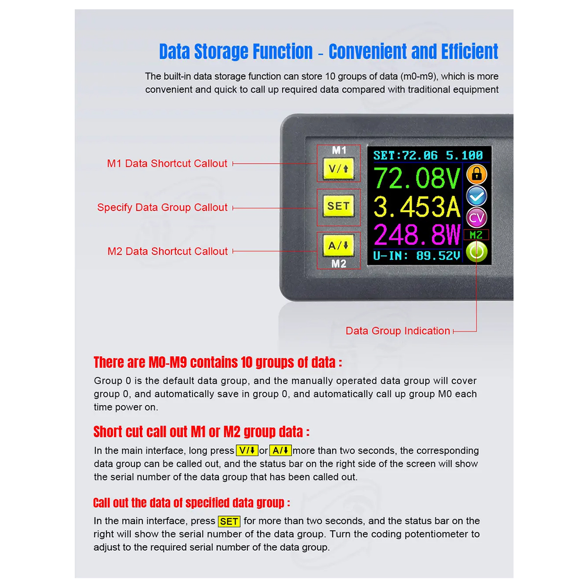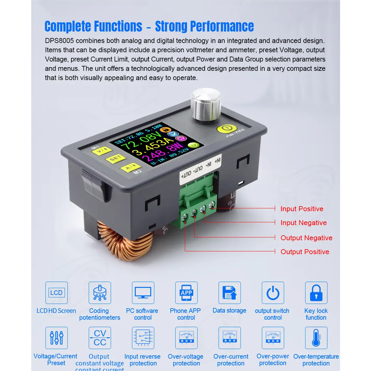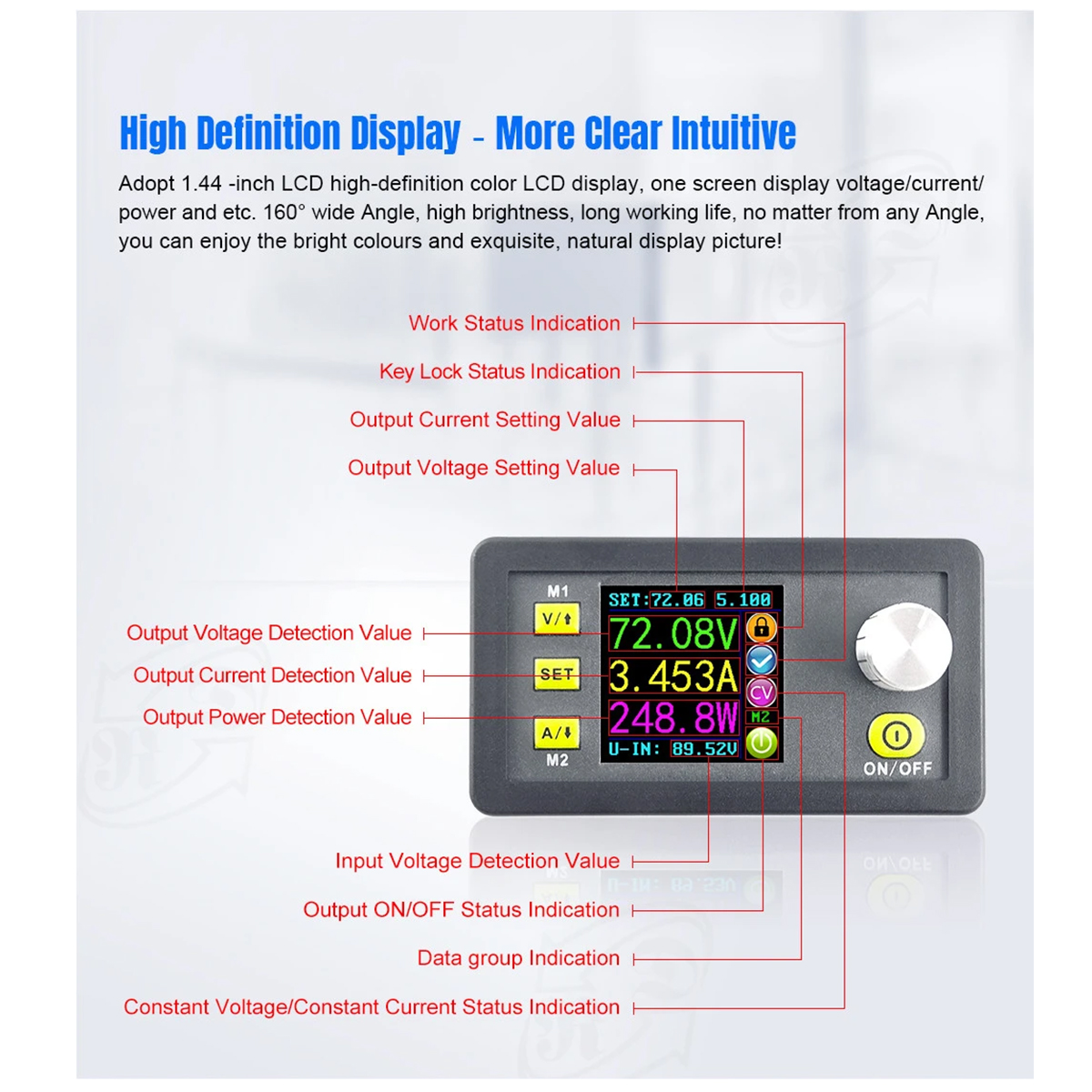 Αυτό το ρυθμιζόμενο module συνδυάζει τις λειτουργίες ενός αναλογικού τροφοδοτικού με την ευκολία τις ρύθμισης και παρακολούθησης ενός ψηφιακού. Το ρυθμιζόμενο εύρος τάσης είναι από 0 μέχρι 50.00V με βήμα 0.01V. Η ρυθμιζόμενη ένταση ρεύματος είναι από 0 έως 20.00Α, με βήμα 0.01VA. Έχει την δυνατότητα αποθήκευσης και παραμετροποίησης 10 προκαθορισμένων συνόλων ρυθμίσεων, οι οποίες μένουν στην μνήμη ακόμα και όταν το αποσυνδέσετε από την τροφοδοσία. Επίσης έχει την δυνατότητα εξαγωγής απευθείας δύο συνόλων αποθηκευμένων τιμών. Σε σύγκριση με τα κλασικά αναλογικά τροφοδοτικά, είναι πιο βολικό για να παράγει την τάση ή την ένταση ρεύματος που χρειάζεται. Η οθόνη LCD του module έχει την δυνατότητα του ψηφιακού βολτόμετρου και αμπερόμετρου. Έχει ενδείξεις τάσης εισόδου-εξόδου, ένδειξη προκαθορισμένης τάσης εισόδου-εξόδου, ένδειξη ισχύς κτλ. Στο αρχικό μενού εμφανίζονται οι ενδείξεις κατάστασης, ανοιχτό/κλειστό, η κατάσταση της σταθερής τάσης και σταθερού ρεύματος, αν η έξοδος λειτουργεί, αν είναι κλειδωμένες οι λειτουργίες και τα προκαθορισμένα σύνολα που χρησιμοποιούνται. Στο μενού Setting μπορεί να ρυθμιστεί η τιμή υπέρτασης και όριο Ampere και Watt, καταχώρηση δεδομένων και η φωτεινότητα της οθόνης. Αυτό το module έχει πολλά πλεονεκτήματα, μικρό μέγεθος, προηγμένες λειτουργίες, χρηστικότητα, ωραίο παρουσιαστικό, μεγάλη ακρίβεια, μπορεί να δουλέψει ανεξάρτητο, να τοποθετηθεί σε συσκευές και να χρησιμοποιηθεί ευρέως.