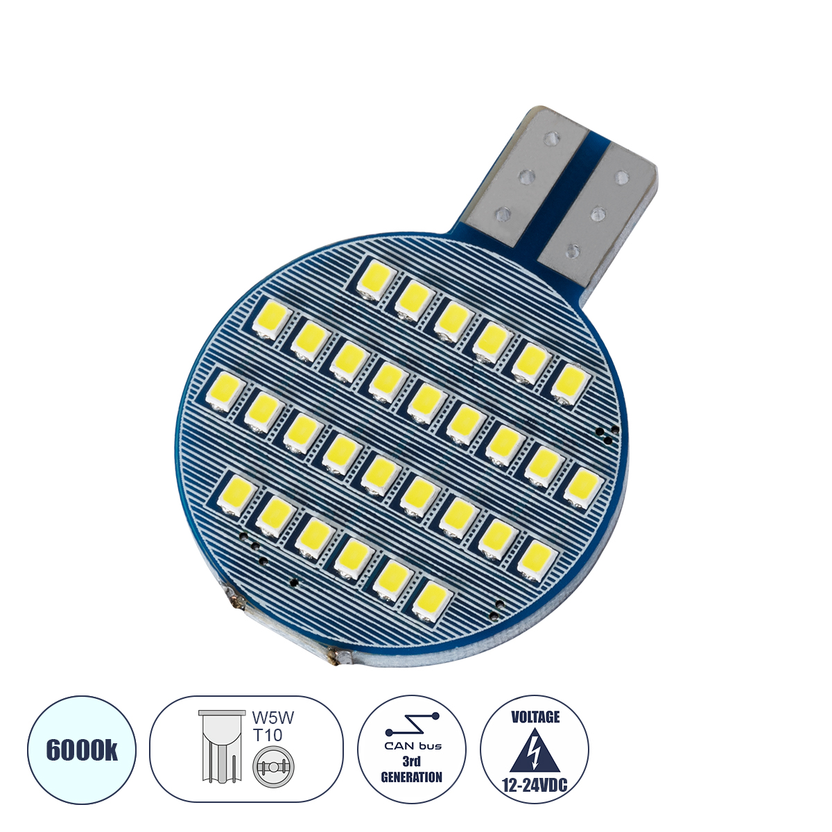 GloboStar® T10 W5W 81481 Λάμπα Αυτοκινήτου LED 3rd Generation Can-Bus 30xSMD2016 4.55W 546lm 120° DC 12-24V IP20 Μ2.7 x Π0.9 x Υ3.7cm Ψυχρό Λευκό 6000K