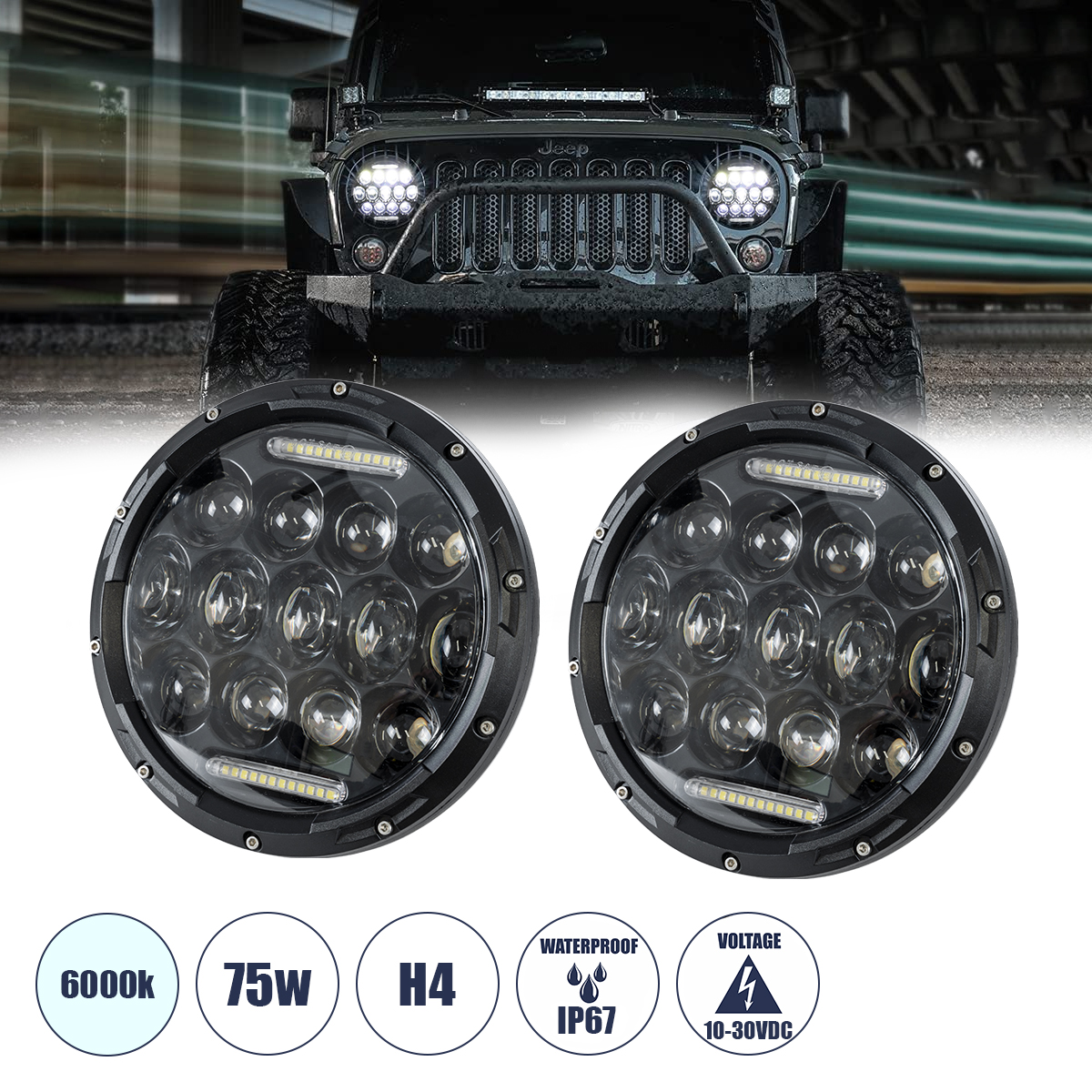 GloboStar® 85417 Σετ 2 x Φανάρια JEEP WRANGLER 7'' Ιντσών Βασικού Φωτισμού H/L με Ring Light DRL & Φλας LED CREE CXB COB 75W 12000lm DC 10-30V Αδιάβροχα IP67 Ψυχρό Λευκό 6000K