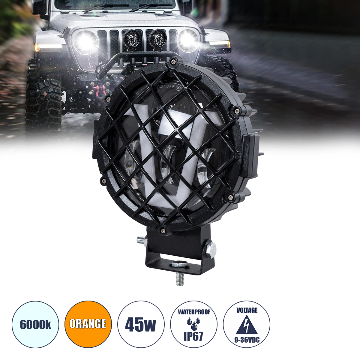 GloboStar® 85439 Vehicle & JEEP Work Lights - Φώτα Εργασίας για Οχήματα και JEEP με V Light DRL & Φλας LED High Power 45W DC 9-36V Αδιάβροχo IP67 Πορτοκαλί & Ψυχρό Λευκό 6000K M17 x Π8 x Υ21cm
