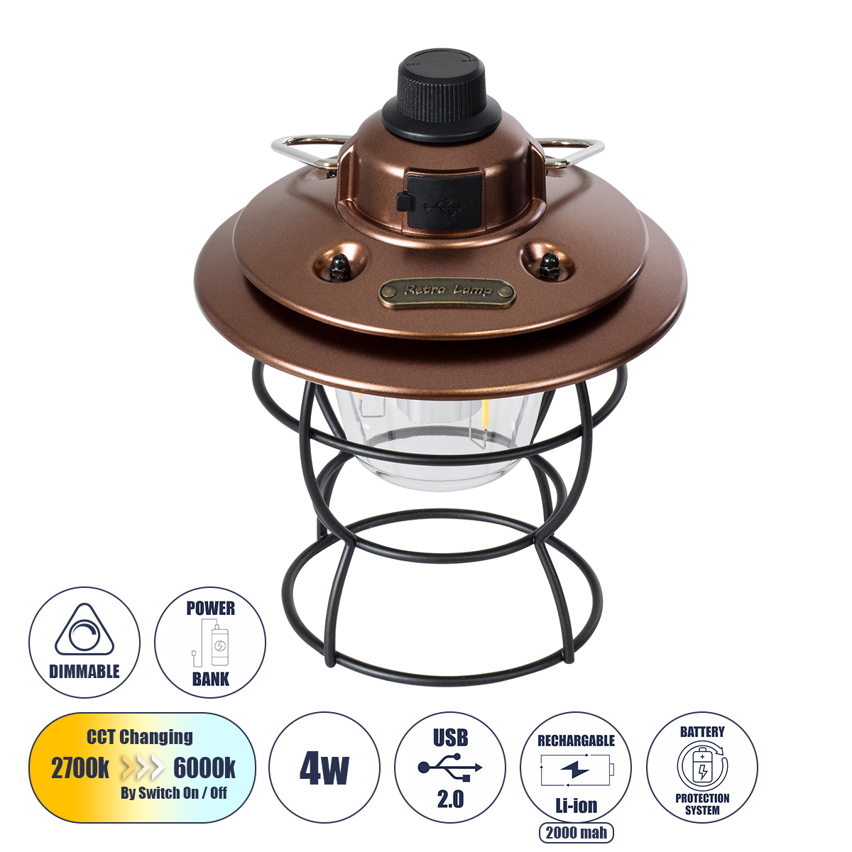GloboStar® 85697 Αυτόνομο Φανάρι Camping LED 4W USB 2.0 με Επαναφορτιζόμενη Μπαταρία 1 x 18650 2000mAh Li-ion Power Bank IP20 Dimmable Καφέ με Διάφανο Γυαλί CCT Εναλλαγή Φωτισμού μέσω On/Off All In One Ψυχρό 6000K+Φυσικό 4500K+Θερμό 2700K Φ13.5 x Υ17.5cm