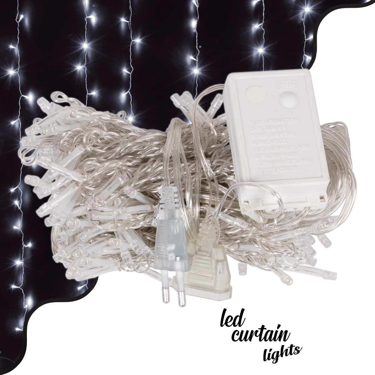 85801 Διακοσμητική Κουρτίνα 3 x 2 Μέτρα με Controller 8 Προγραμμάτων Φωτισμού - Επεκτεινόμενη 240 LED 6W AC 230V με Διάφανο Καλώδιο & Πρίζα Schuko IP20 Ψυχρό Λευκό 6000K Μ3 x Υ2m