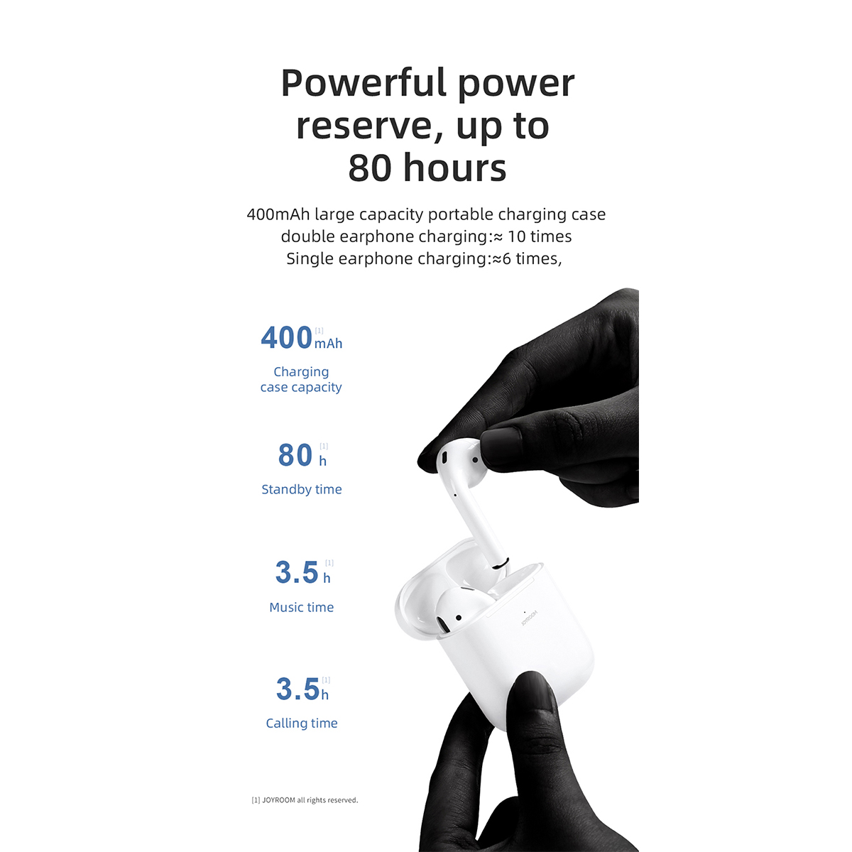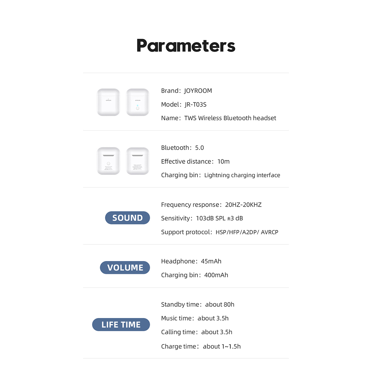 6. Powerful power reserve, long standby time of 80 hours (T03 charging bin 350, T03S charging bin 400mAH)