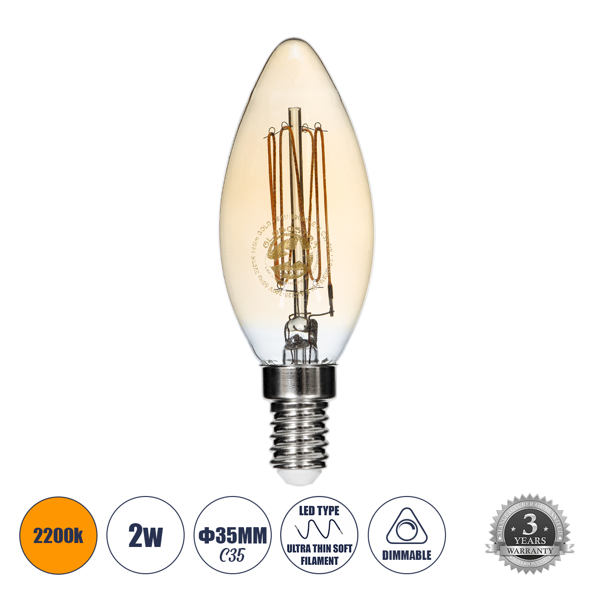 GLOBOSTAR® CANDLE 99058 Λάμπα Κεράκι E14 C35 LED 2W 140lm 360° AC 220-240V IP20 Ultra Θερμό Λευκό 2200K Dimmable - Ultra Thin Soft Spiral Filament Chip - Μελί - Μ3.5 x Π3.5 x Υ10.5cm - 3 Χρόνια Εγγύηση