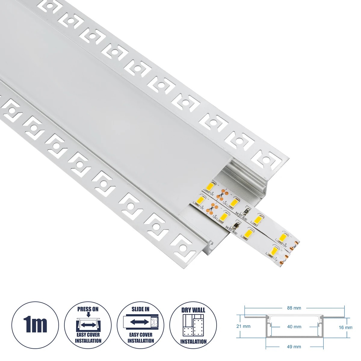 GLOBOSTAR® ALP-PLASTERIN GYPSO 70862-1M Χωνευτό Προφίλ Αλουμινίου Ειδικό για Γυψοσανίδα με Λευκό Γαλακτερό Πατητό Κάλυμμα για Ταινίες LED IP20 - Ασημί & Λευκό - Μ100 x Π8.8 x Υ2cm