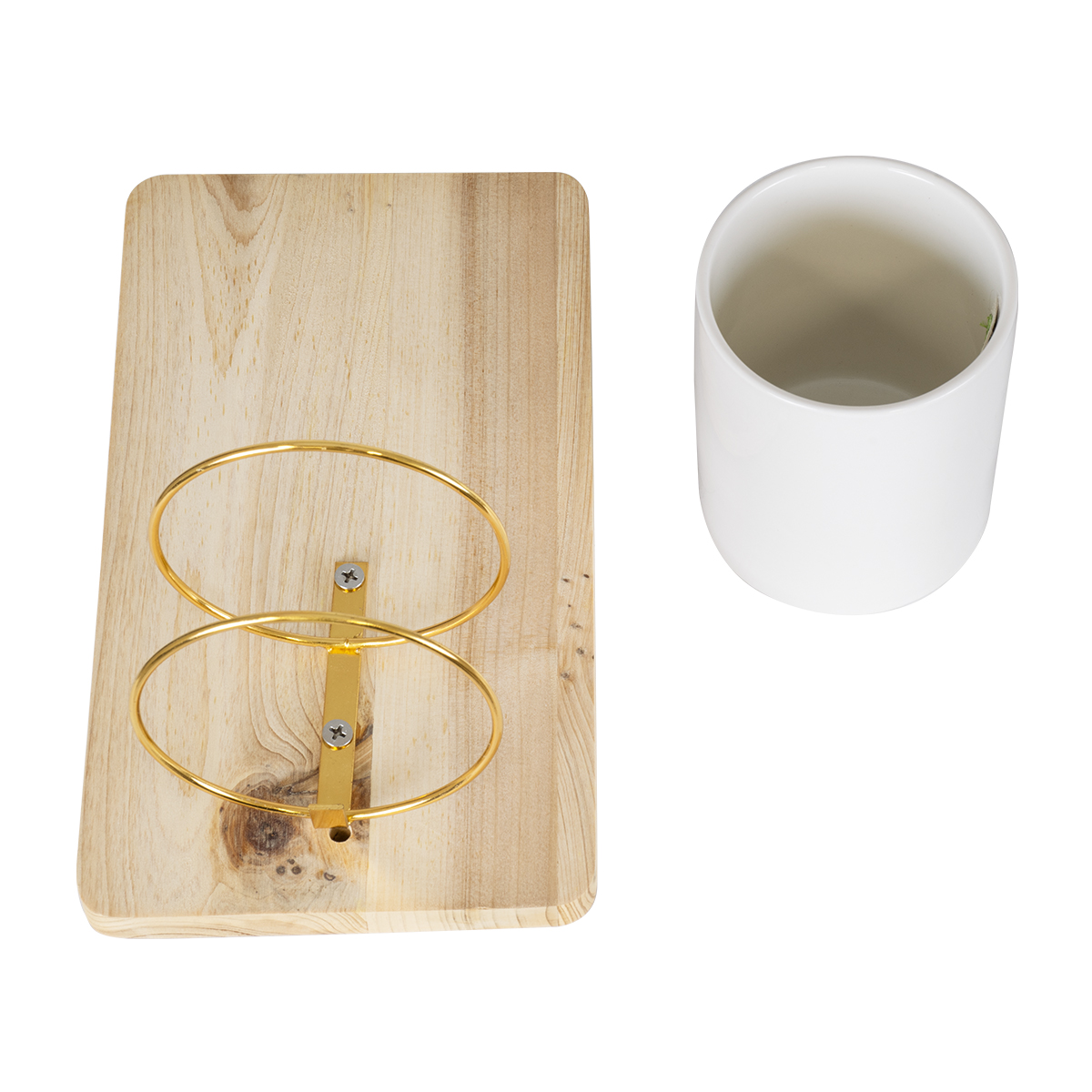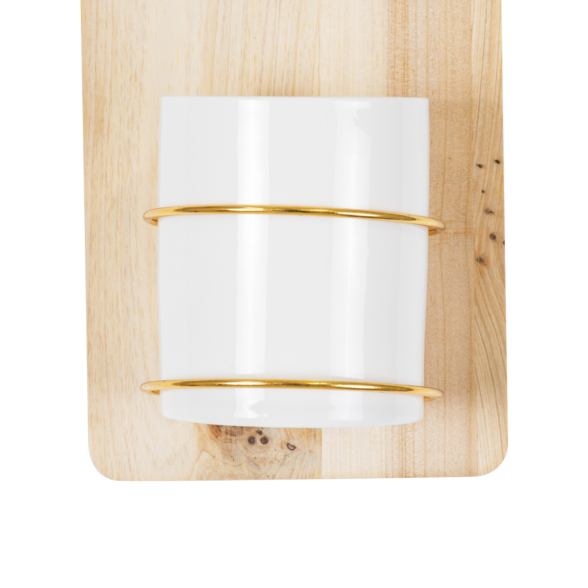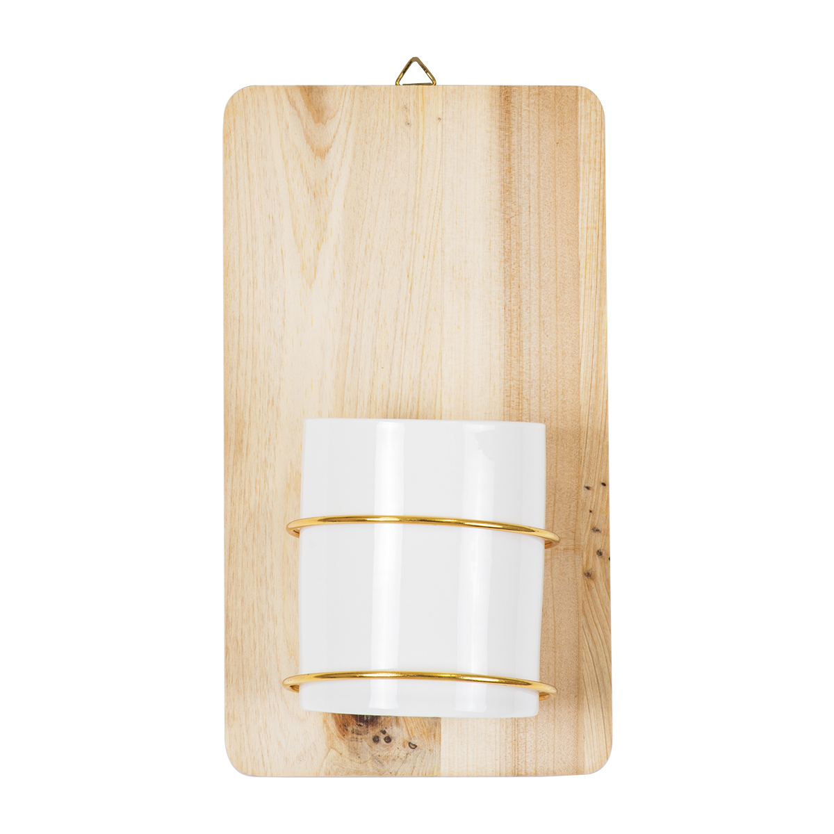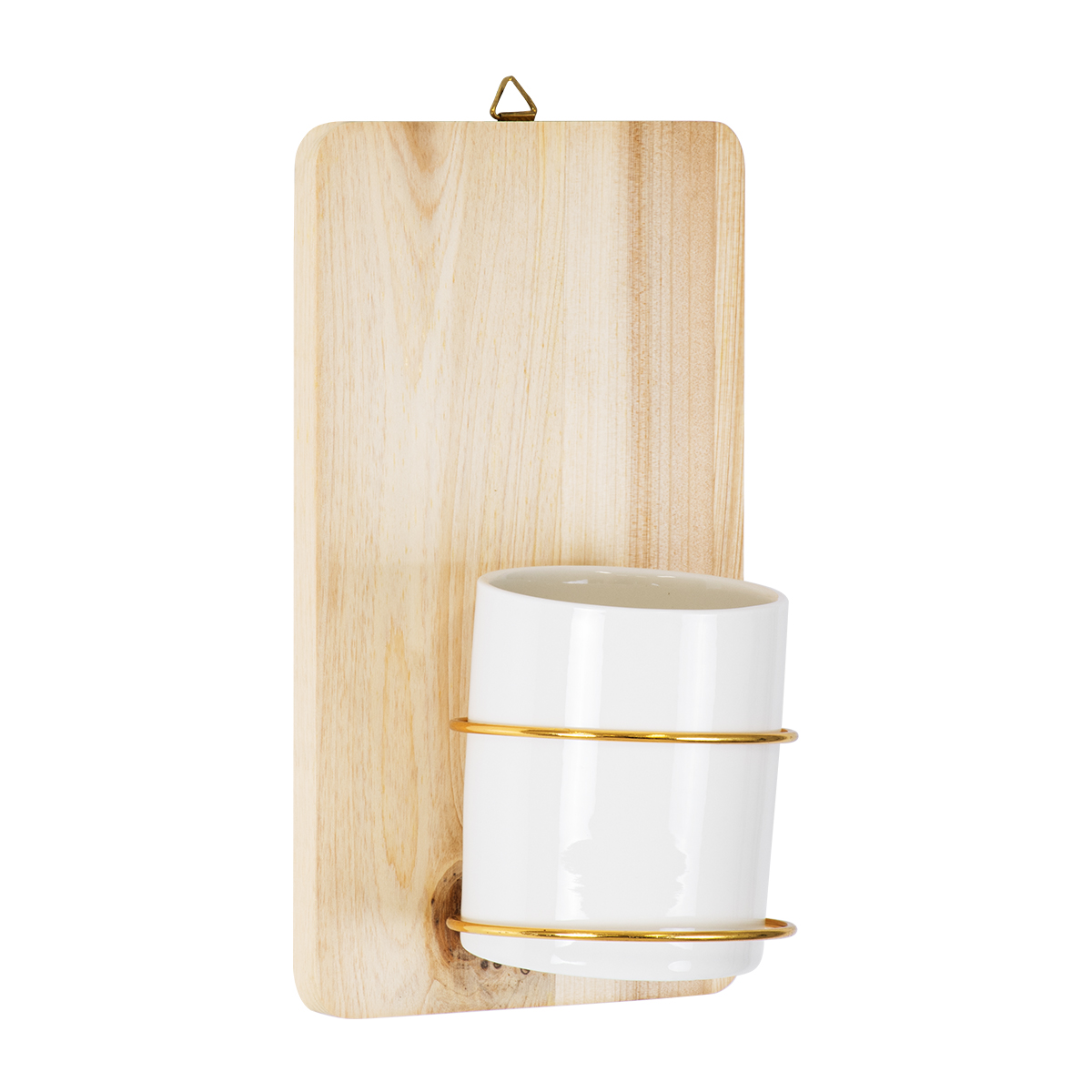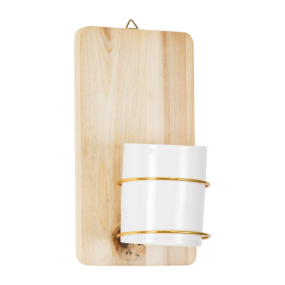 GloboStar® Artificial Garden IKARIA 20472 Επιτοίχιο Πήλινο Κεραμικό Κασπώ Γλάστρα με Ξύλινη Βάση - Flower Pot Μπεζ με Λευκό & Χρυσό Φ13cm x Υ23cm