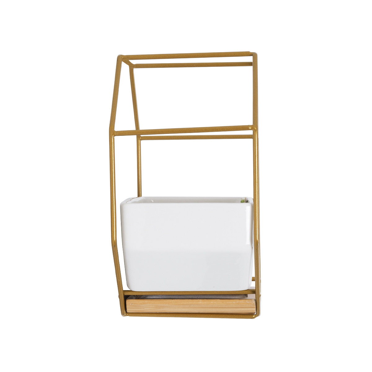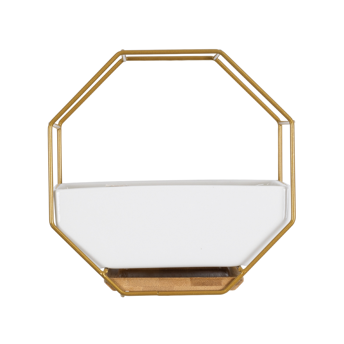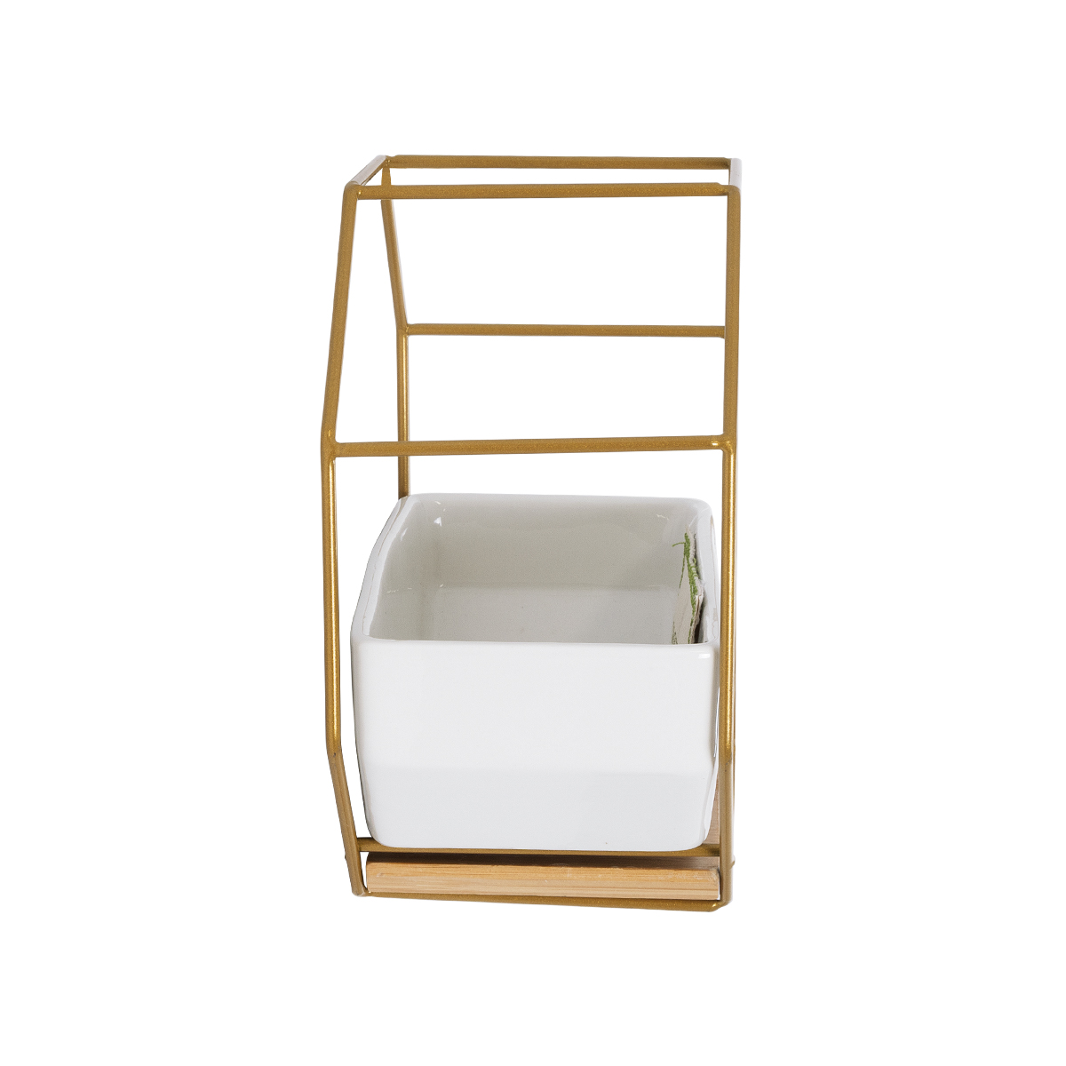 GloboStar® Artificial Garden MANDRITE 20556 Διακοσμητικό Κεραμικό Κασπώ Γλάστρα - Flower Pot Λευκό με Χρυσό Μεταλλικό Πλέγμα και Καφέ Ξύλινη Βάση Μ18 x Π10 x Υ18cm