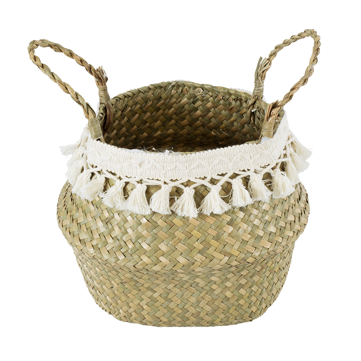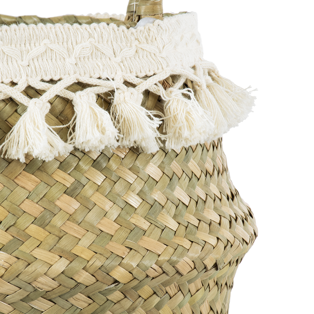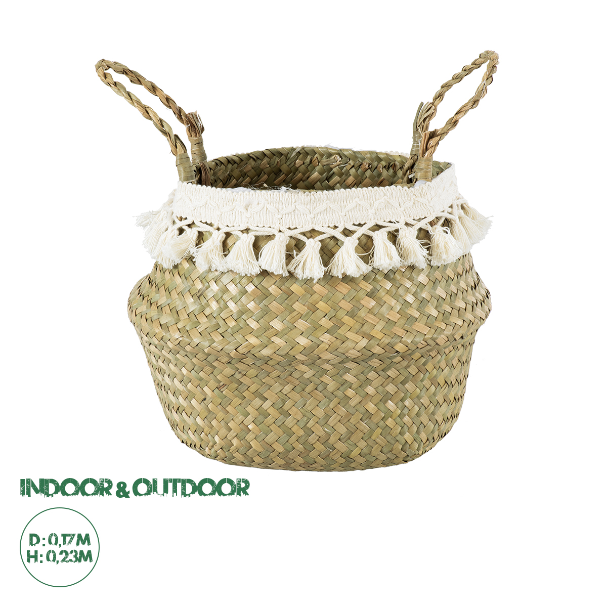 GloboStar® Artificial Garden MILOS 20306 Διακοσμητικό Ψάθινο Καλάθι - Κασπώ Γλάστρα - Flower Pot Μπεζ με Μακραμέ Φ17cm x Υ23cm