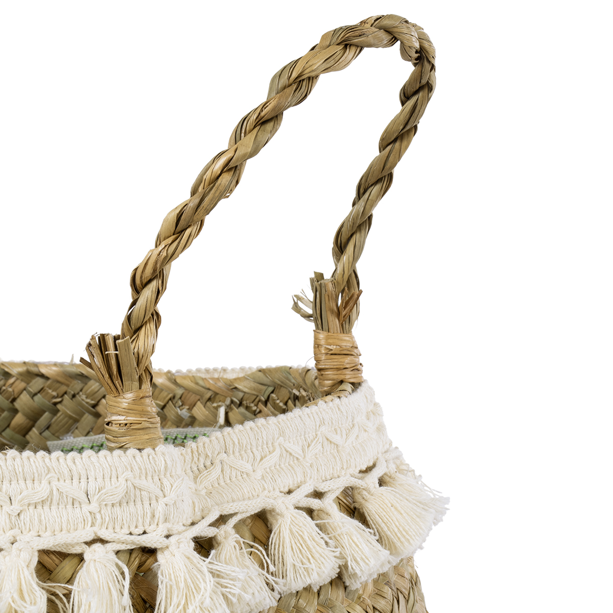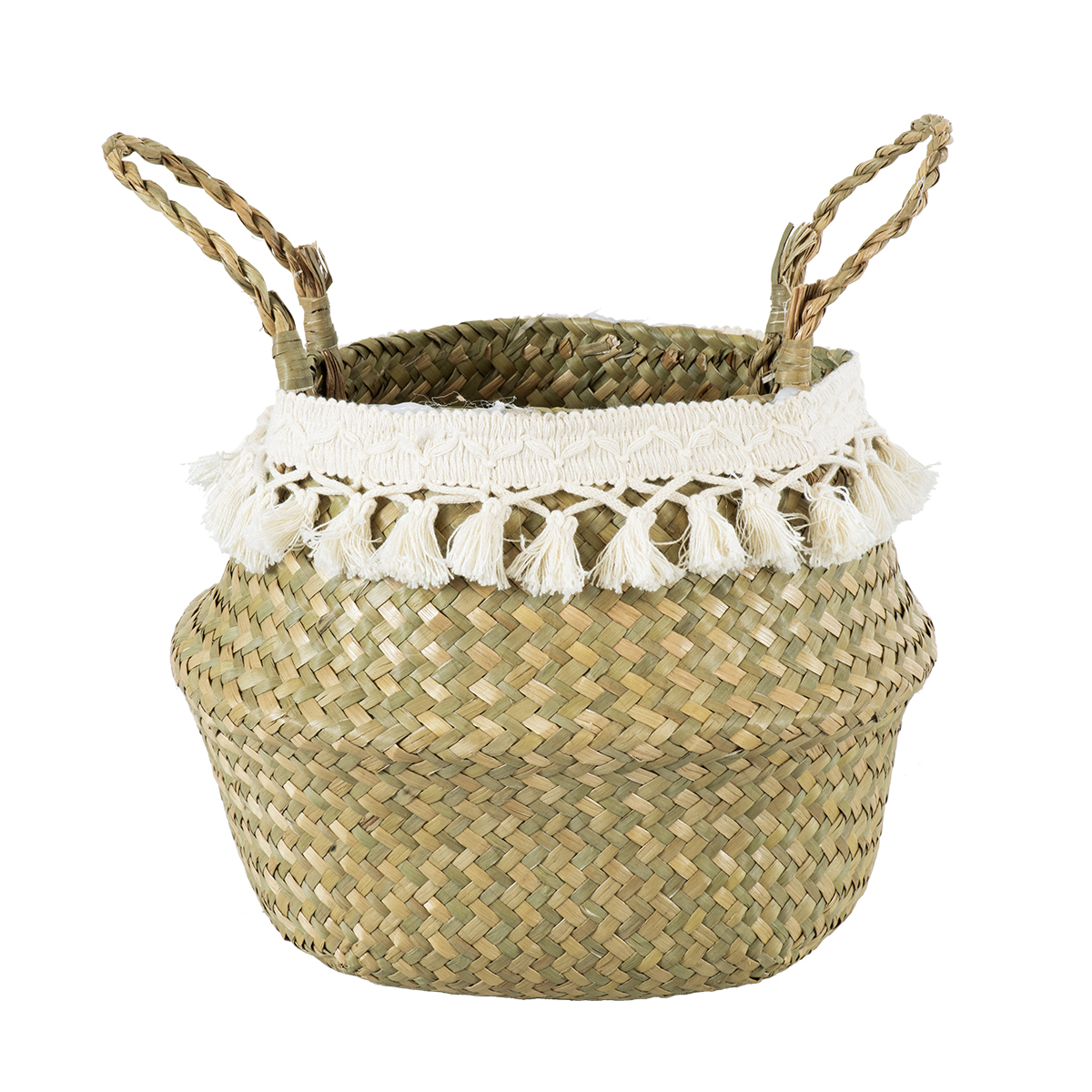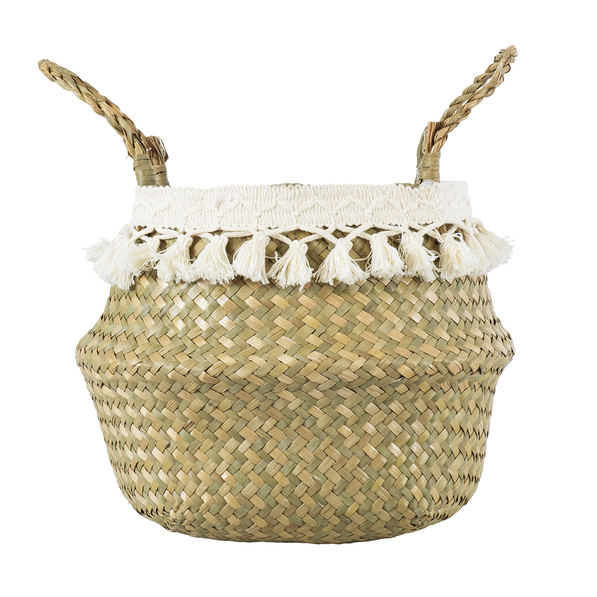 GloboStar® Artificial Garden MILOS 20306 Διακοσμητικό Ψάθινο Καλάθι - Κασπώ Γλάστρα - Flower Pot Μπεζ με Μακραμέ Φ17cm x Υ23cm
