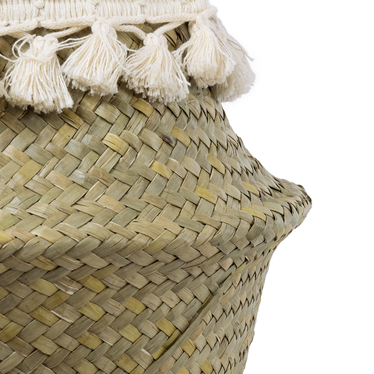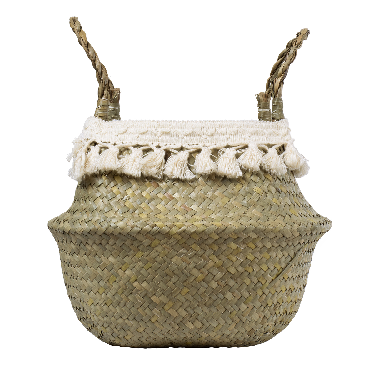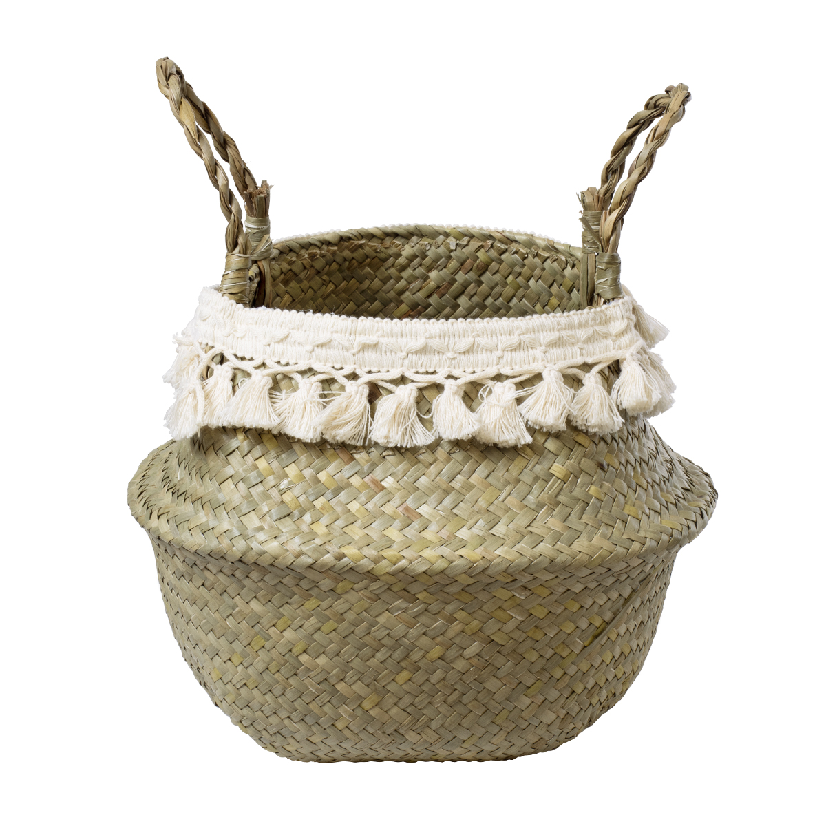 GloboStar® Artificial Garden MILOS 20307 Διακοσμητικό Ψάθινο Καλάθι - Κασπώ Γλάστρα - Flower Pot Μπεζ με Μακραμέ Φ21cm x Υ26cm