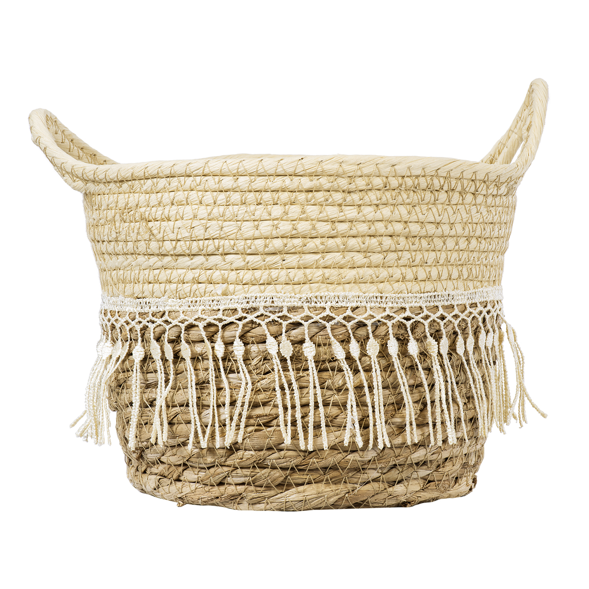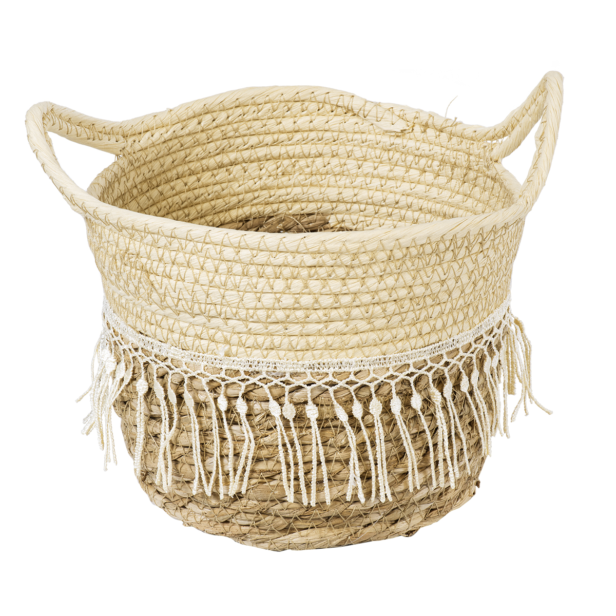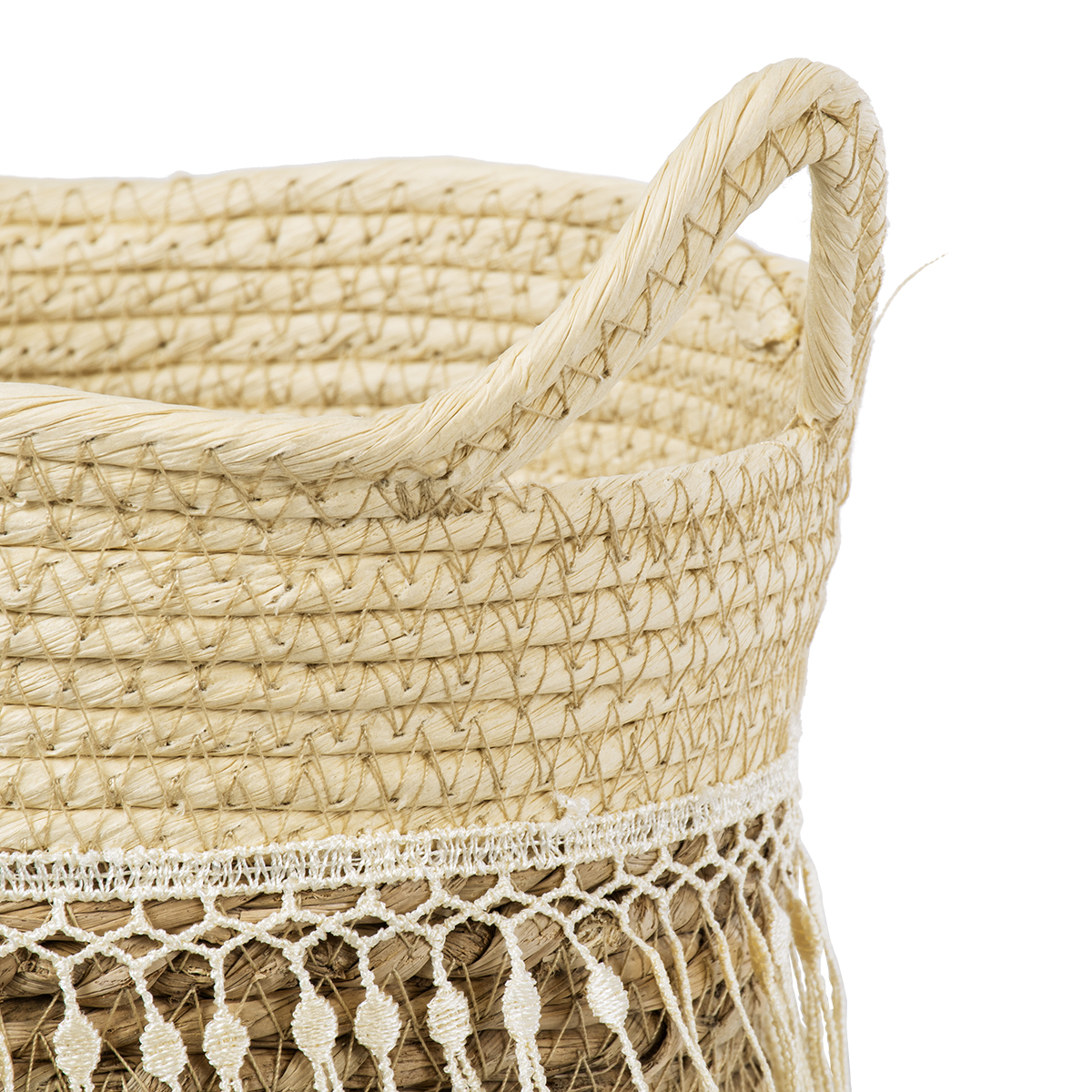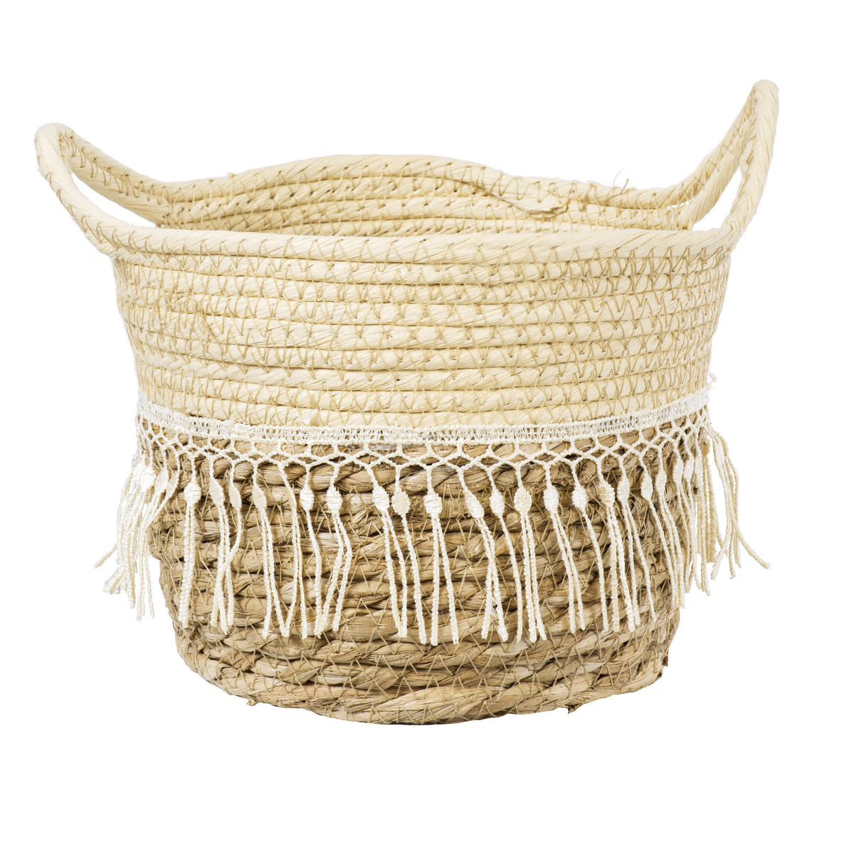 GloboStar® Artificial Garden MYKONOS 20278 Διακοσμητικό Πλεκτό Καλάθι - Κασπώ Γλάστρα - Flower Pot Μπεζ με Μακραμέ Φ18cm x Υ15cm