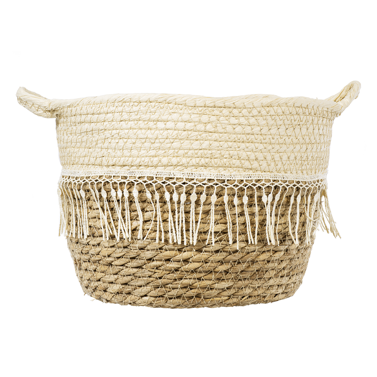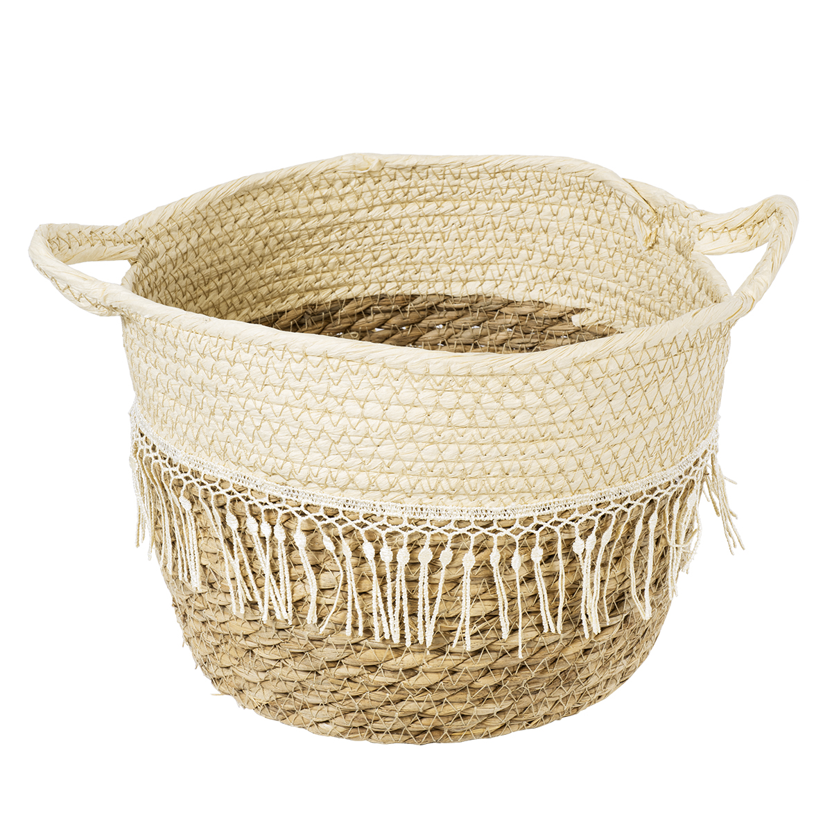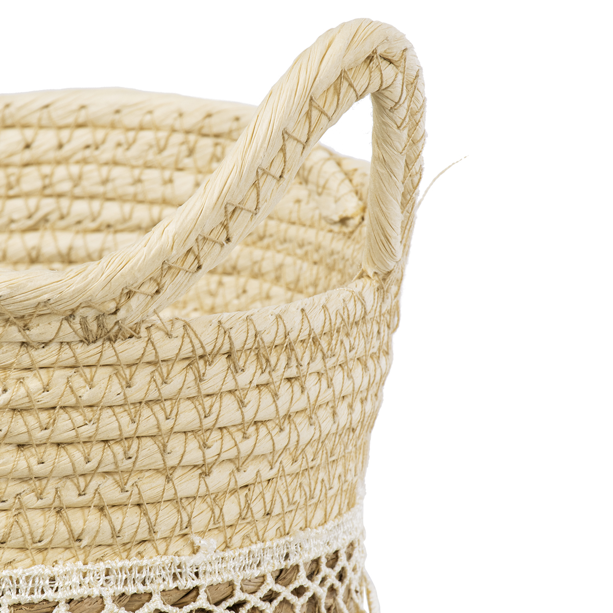 GloboStar® Artificial Garden MYKONOS 20280 Διακοσμητικό Πλεκτό Καλάθι - Κασπώ Γλάστρα - Flower Pot Μπεζ με Μακραμέ Φ25cm x Υ19cm