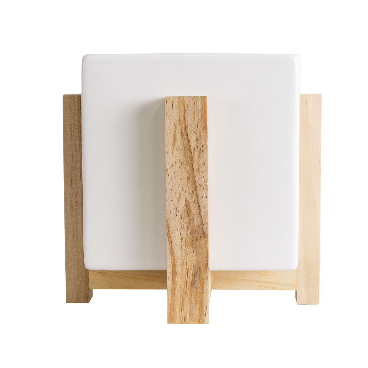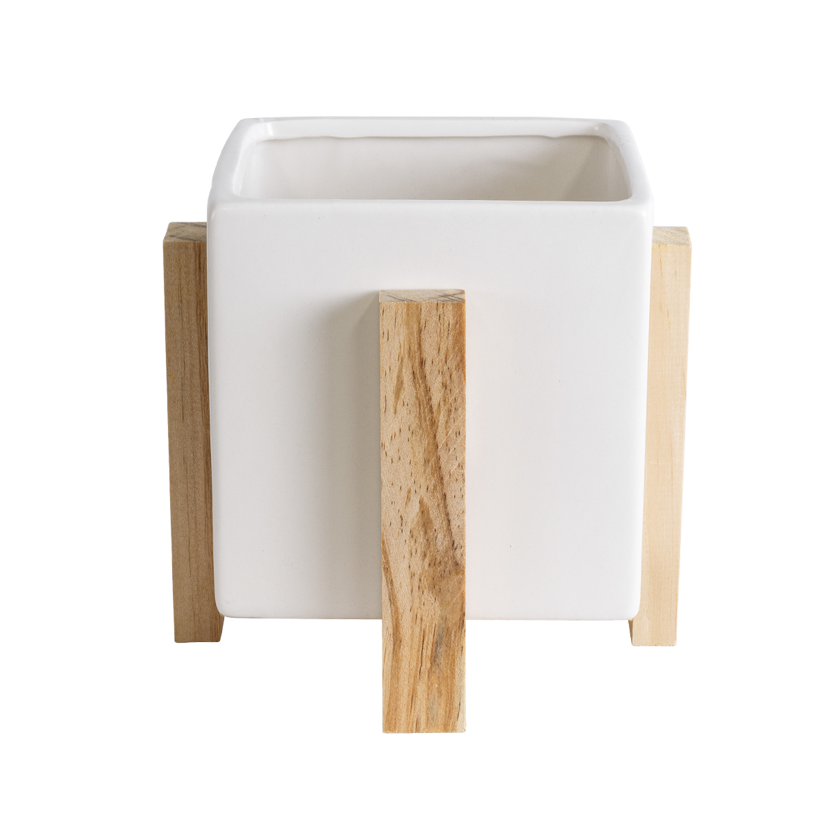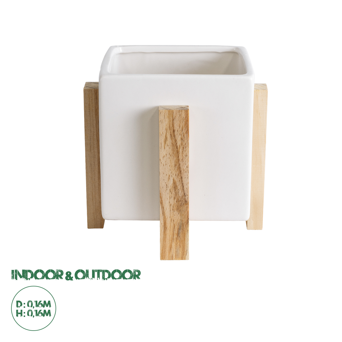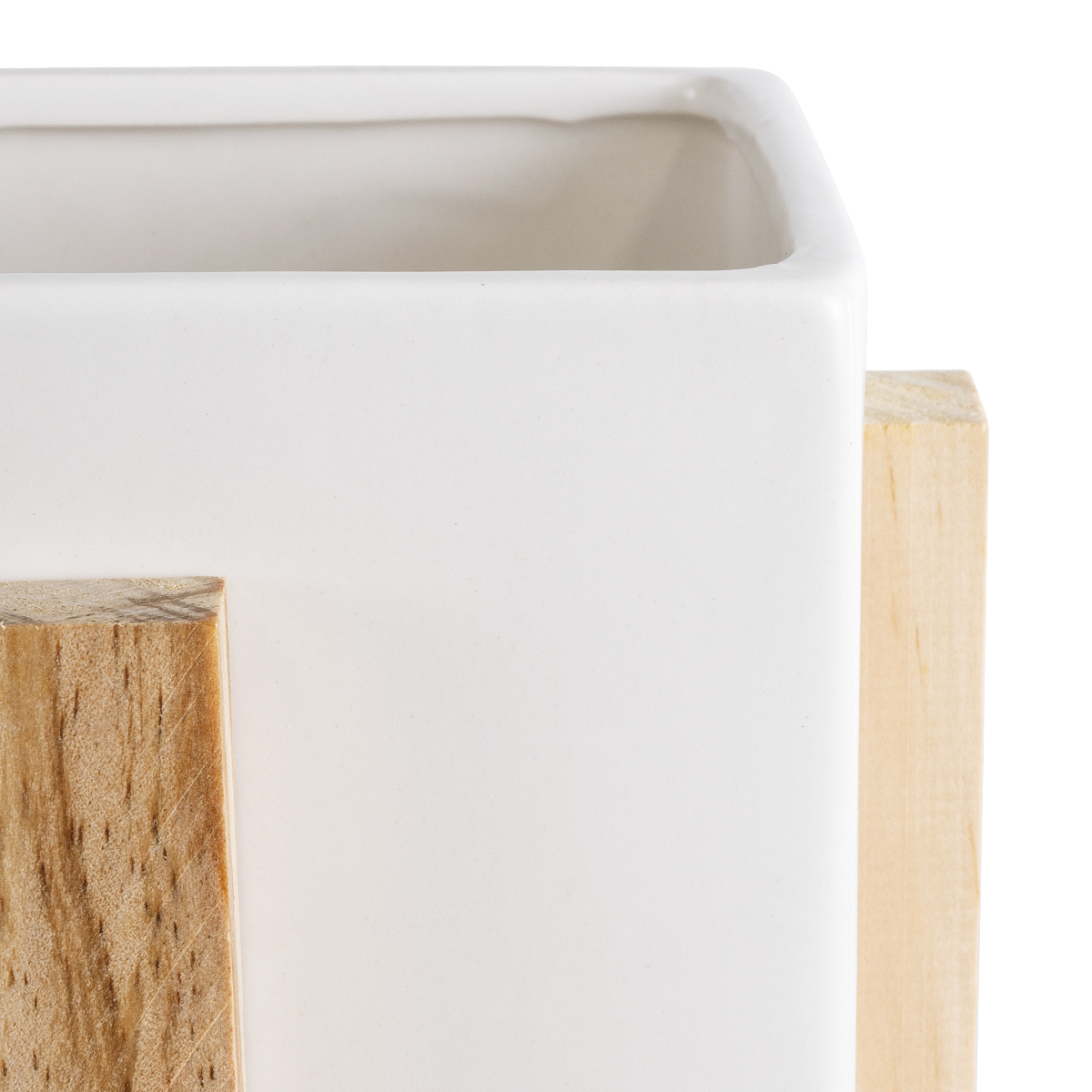 GloboStar® Artificial Garden VALETA 20541 Διακοσμητικό Κεραμικό Κασπώ Γλάστρα - Flower Pot Λευκό με Μπεζ Ξύλο Φ16 x Υ16cm