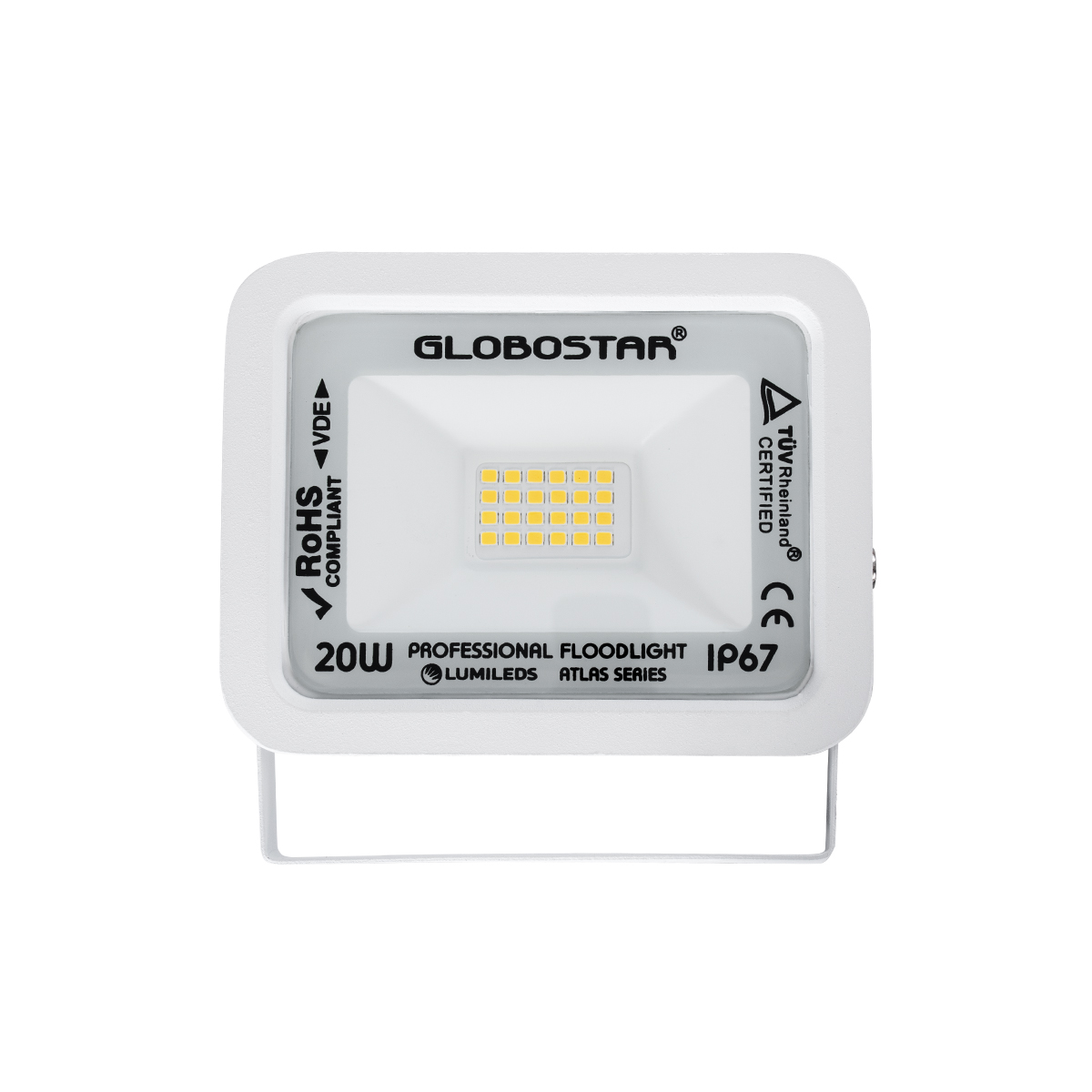 GLOBOSTAR® ATLAS 61409 Προβολέας LED 20W 2300lm 120° AC 220-240V Αδιάβροχο IP67 Θερμό Λευκό 2700K - Lumileds SMD Chip - TÜV Rheinland Certified - Λευκό Ματ - Μ12 x Π2.5 x Υ9.5cm - 5 Χρόνια Εγγύηση