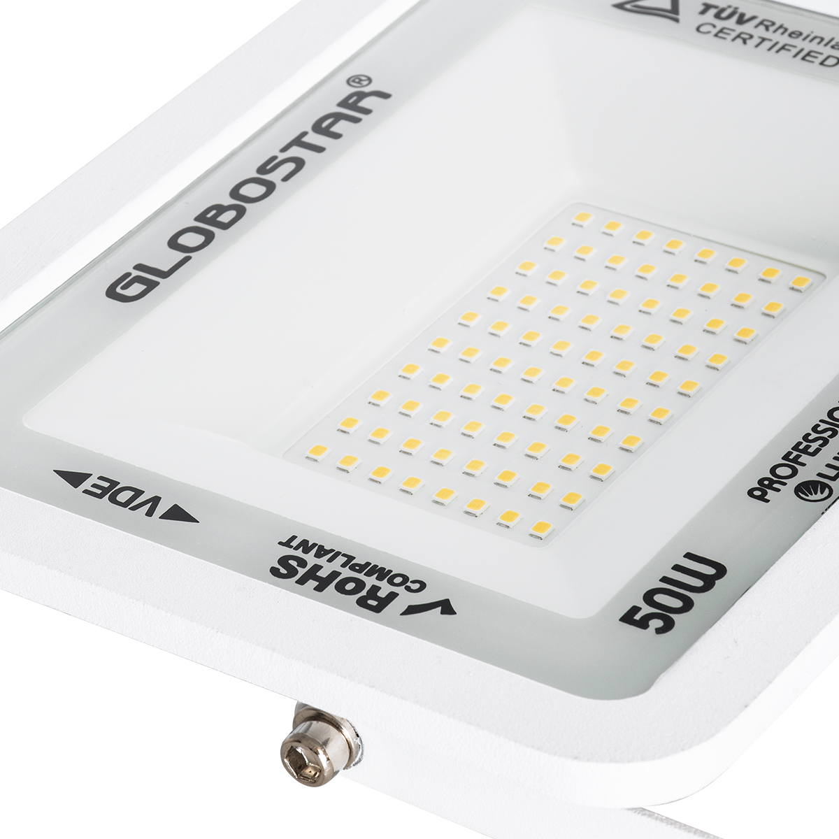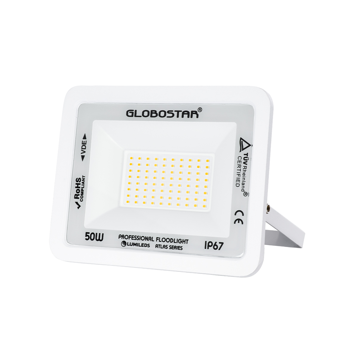 GLOBOSTAR® ATLAS 61421 Προβολέας LED 50W 5750lm 120° AC 220-240V Αδιάβροχο IP67 Θερμό Λευκό 2700K - Lumileds SMD Chip - TÜV Rheinland Certified - Λευκό Ματ - Μ21 x Π3.5 x Υ16cm - 5 Χρόνια Εγγύηση