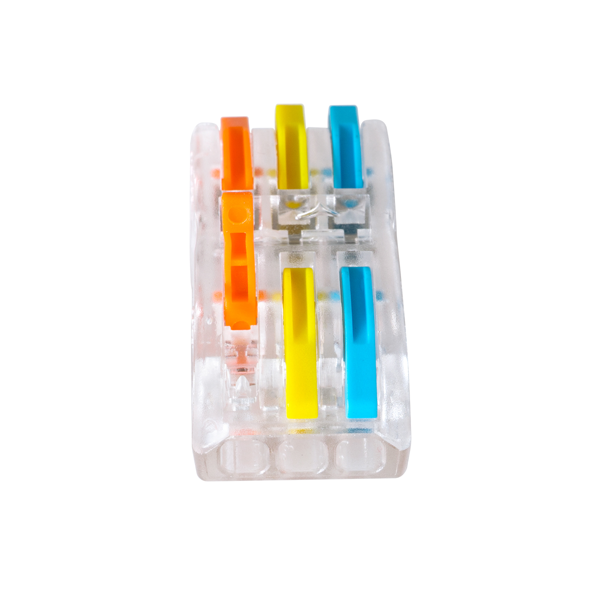 GloboStar® FAST-CONNECT 69908 Τριπλή Κλέμα Ταχείας Σύνδεσης & Διακλάδωσης Καλωδίων - 3 x Είσοδοι & 3 x Έξοδοι με Συμβατή Διατομή Καλωδίων 0.08mm² έως 2.5mm² - 250V/4KV 32A Max - Μ4 x Π4 x Υ1.5cm - Διάφανο με Πορτοκαλί, Κίτρινο & Μπλε - Πακέτο 5 Τεμαχίων