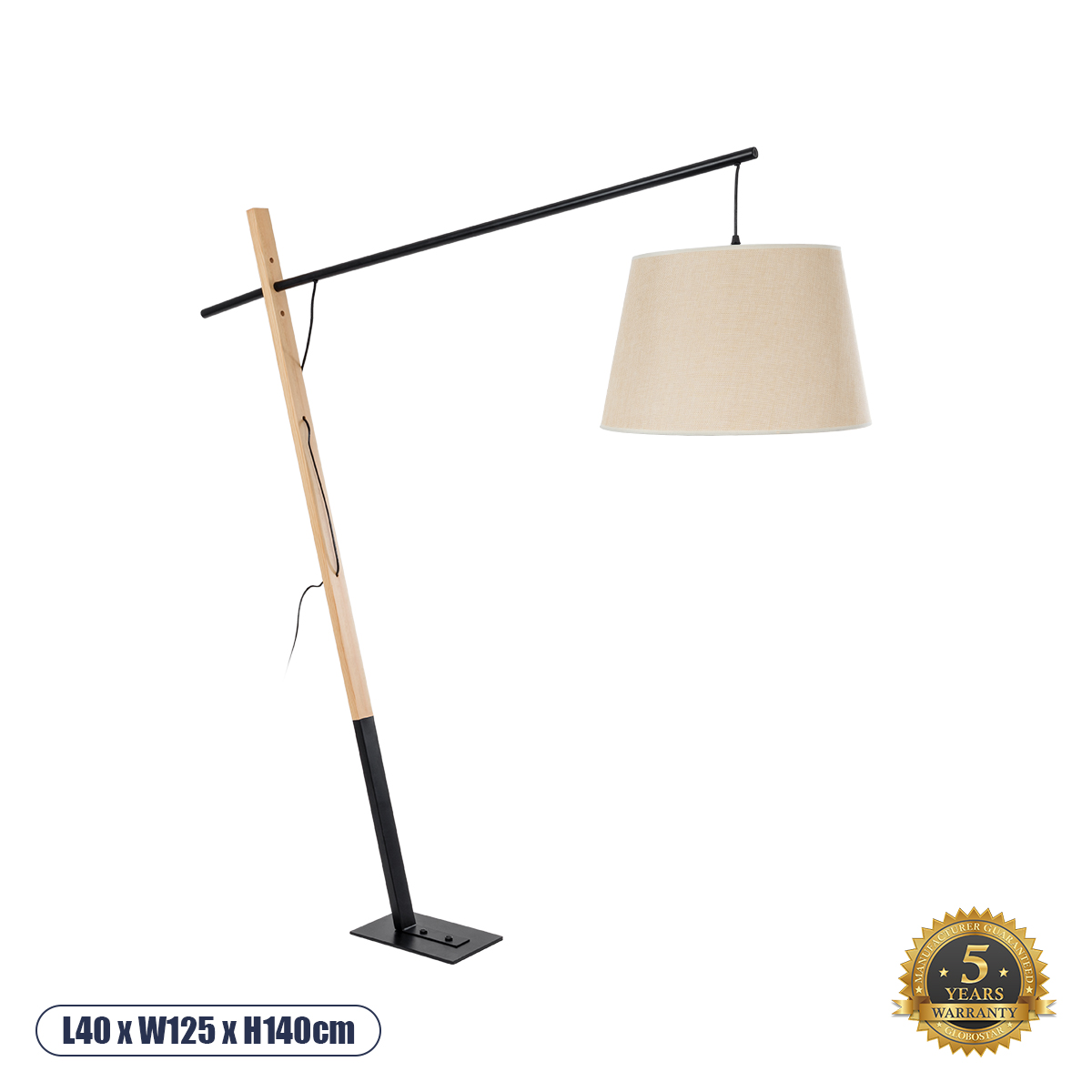GloboStar® KELSIE 02030 Μοντέρνο Επιδαπέδιο Φωτιστικό Μονόφωτο 1 x E27 IP20 Μαύρο Μέταλλο, Μπεζ Ύφασμα με Μπεζ Ξύλο - Μ40 x Π125 x Υ140cm