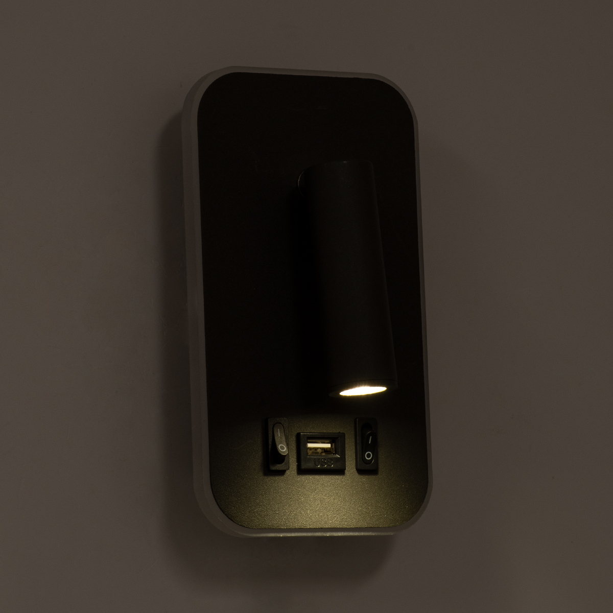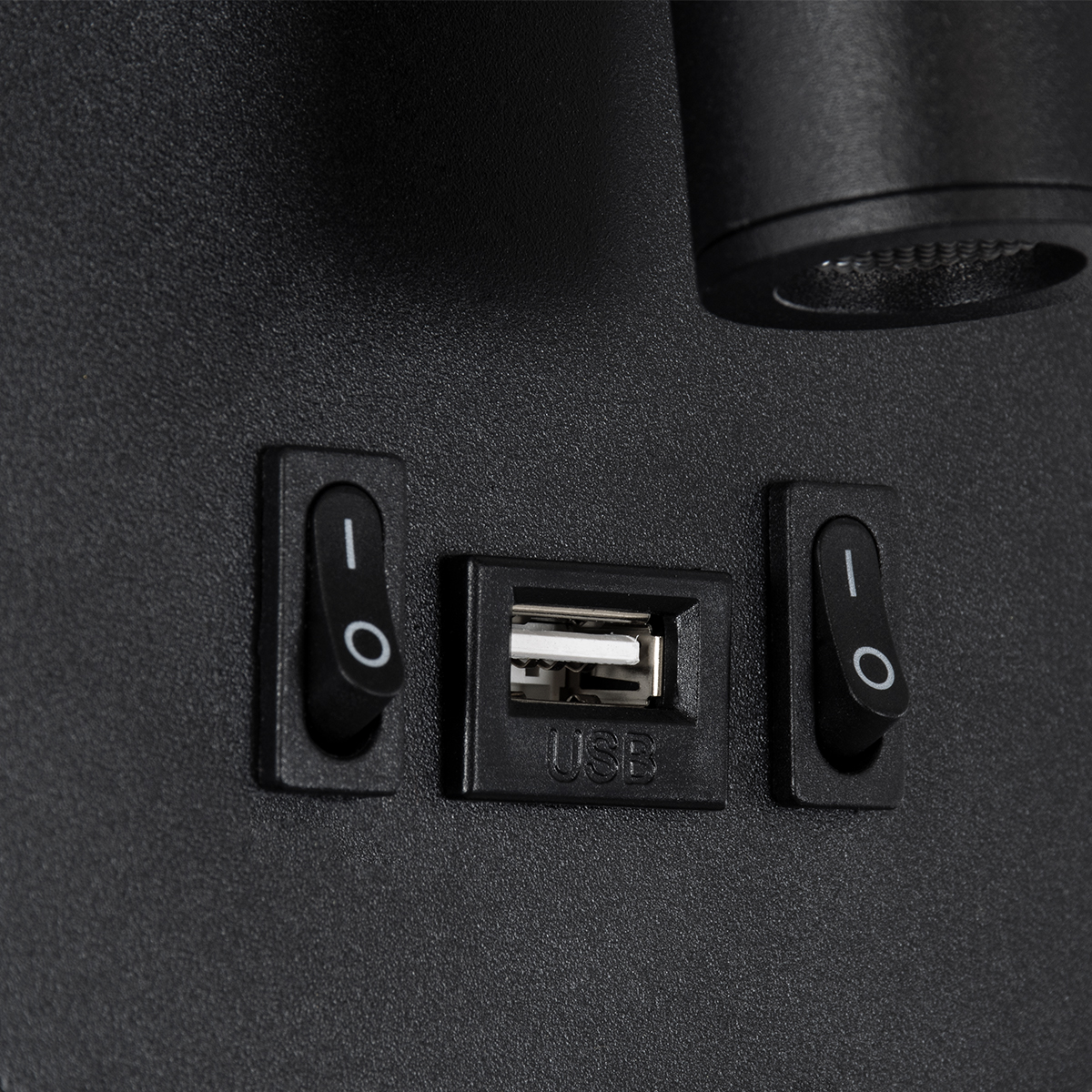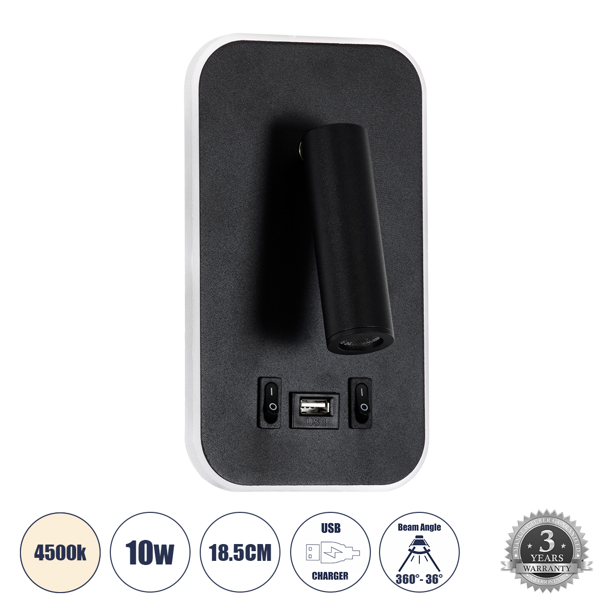 GLOBOSTAR® LADY-O 61363 Μοντέρνο Φωτιστικό Τοίχου - Απλίκα Ξενοδοχείου Reading Light με Φορτιστή USB 3A LED 10W 1000lm 36° & 360° AC 220-240V IP20 Φυσικό Λευκό 4500K - Bridgelux COB Chip & TÜV SÜD Driver - Μαύρο Ματ - Μ10.5 x Π10 x Υ18.5cm - 3 Χρόνια Εγγύ