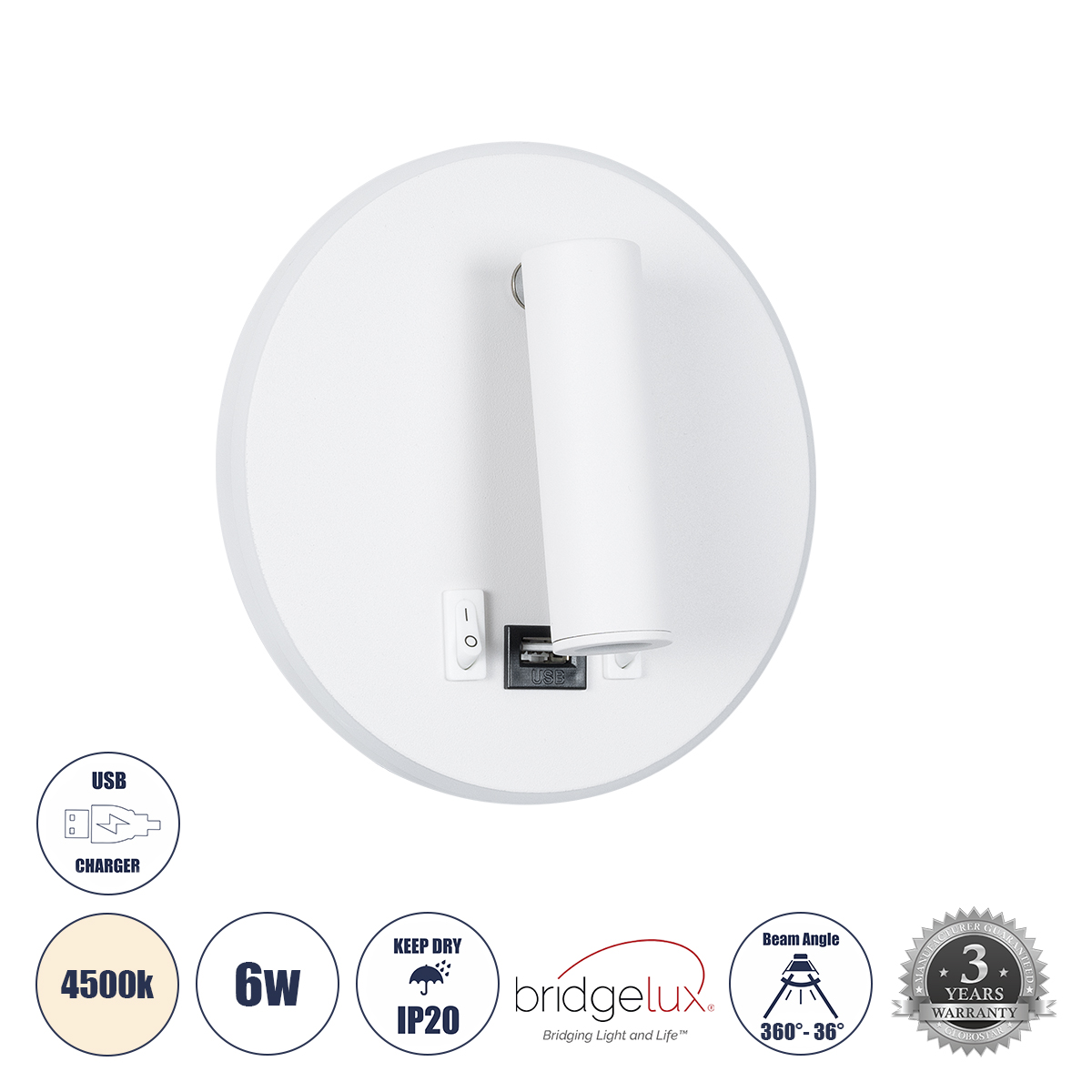 GLOBOSTAR® LADY-R 60939 Μοντέρνο Φωτιστικό Τοίχου - Απλίκα Ξενοδοχείου Reading Light με Φορτιστή USB 3A LED 6W 600lm 36° & 360° AC 220-240V IP20 Φυσικό Λευκό 4500K - Bridgelux COB & TÜV SÜD Driver - Λευκό Ματ - Μ15 x Π15 x Υ17cm - 3 Χρόνια Εγγύηση