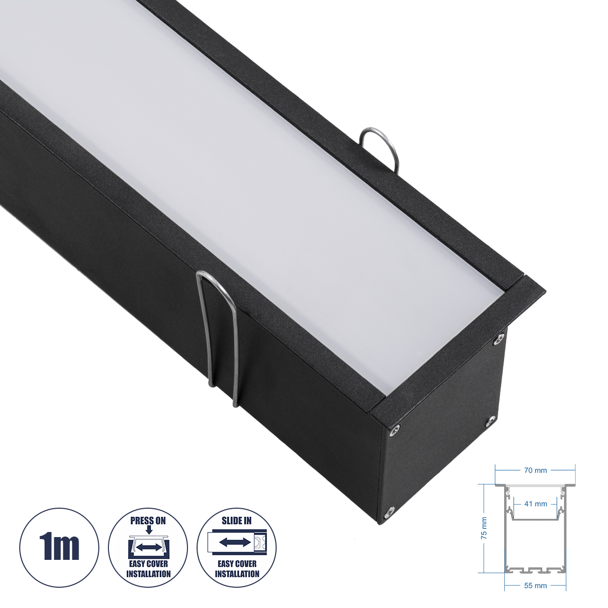 GloboStar® RECESS-PROFILE 70818-1M Προφίλ Αλουμινίου - Βάση & Ψύκτρα Ταινίας LED με Λευκό Γαλακτερό Κάλυμμα - Χωνευτή Χρήση - Πατητό Κάλυμμα - Μαύρο - 1 Μέτρο - Μ100 x Π7.5 x Υ7cm