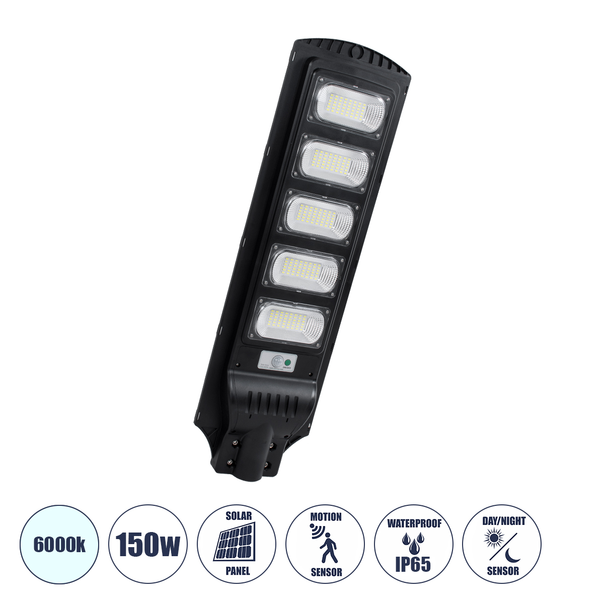 GloboStar® STREETA 85345 Professional LED Solar Street Light Αυτόνομο Ηλιακό Φωτιστικό Δρόμου 150W 1500lm 240 x LED SMD 5730 με Ενσωματωμένο Φωτοβολταϊκό Panel 6V 18W & Επαναφορτιζόμενη Μπαταρία Li-ion 3.2V 20000mAh με Αισθητήρα Ημέρας-Νύχτας & PIR Αισθητ