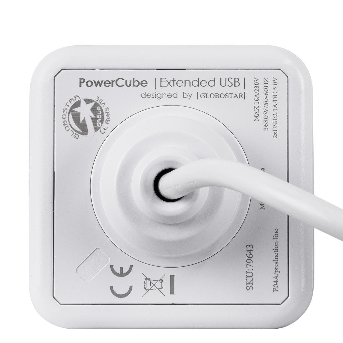 GloboStar® TRAVEL PowerCube PRO Certified 79643 Πολύπριζο 6 Θέσεων με 1.5m Kαλώδιο - 4 Πρίζες Ασφαλείας Childproof EU Schuko AC 220-240V & 2 Πρίζες USB Max 2.1A/DC 5V Μ7.5 x Π7.5 x Υ7.5 - Λευκό με Μπλε - Max Load 3680W/16A