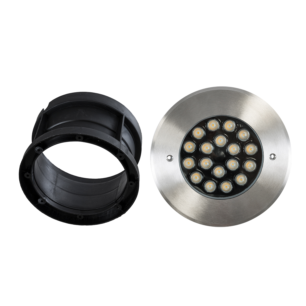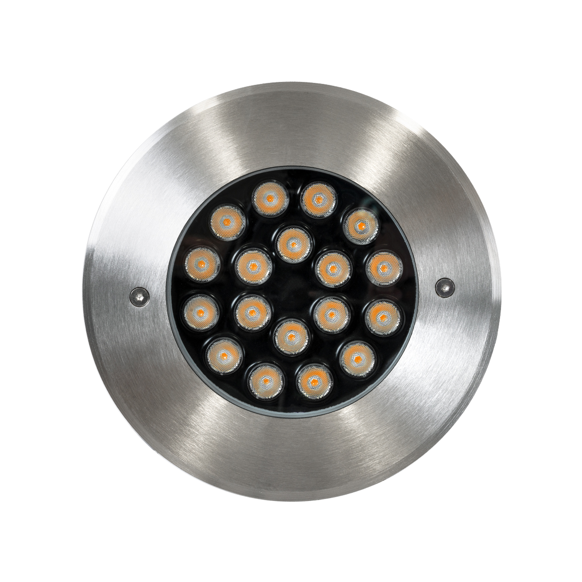 GloboStar® UNDERGROUND-SINA 90571 Χωνευτό Φωτιστικό Σποτ Δαπέδου LED 18W 1620lm 15° DC 24V Αδιάβροχο IP68 Φ20 x Υ11cm Θερμό Λευκό 2700K - Ανοξείδωτο Ατσάλι - 3 Χρόνια Εγγύηση