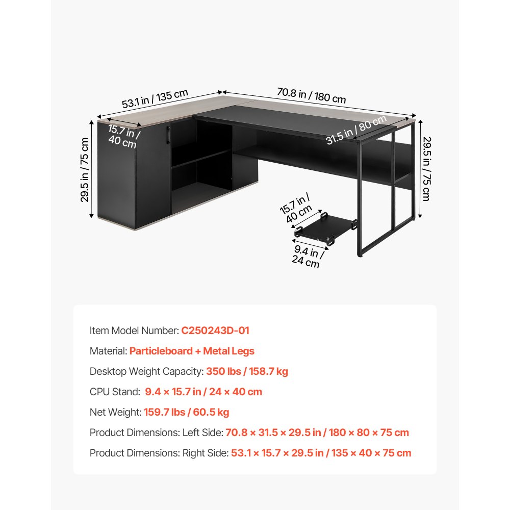 Αριθμός μοντέλου αντικειμένου: C250243D-01Υλικό: Μοριοσανίδα + Μεταλλικά ΠόδιαΧωρητικότητα βάρους επιφάνειας εργασίας: 350 λίβρες/158,7 κιλάΆνω συρτάρι: 26,4 x 15,3 x 13 ίντσες/67 x 39 x 33 εκ.Κάτω συρτάρι: 54,1 x 12,4 x 7,8/13,2 ίντσες/137,5 x 31,5 x 20/33,5 εκ.Βάση CPU: 9,4 x 15,7 ίντσες/24 x 40 εκ.Άνω ράφι: 12,2 x 14,7 x 13,2 ίντσες/31 x 37,5 x 33,5 εκ.Κάτω ράφι: 12,2 x 14,7 x 14,3 ίντσες/31 x 37,5 x 36,5 εκ.Διαστάσεις προϊόντος: Δεξιά πλευρά