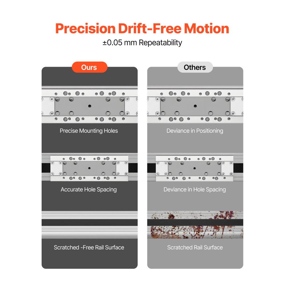 Κιτ γραμμικής ράγας CNC: Αυτό το σετ περιλαμβάνει μία γραμμική ράγα οδηγού κίνησης με αποτελεσματική διαδρομή 600 mm, συμβατή με μηχανές χάραξης, φρέζες CNC και εκτυπωτές 3D. Προστασία από σκουριά και διάβρωση: Κατασκευασμένο με ιμάντα PU, μπλοκ ολίσθησης από κράμα αλουμινίου και βηματικό κινητήρα NEMA 34. Διαθέτει ηλεκτρολυτική επίστρωση ≥10 μm για αντοχή στη διάβρωση και τη σκουριά ακόμη και σε υγρά περιβάλλοντα όπως υπόγεια. Αξιόπιστη ικανότητα φόρτωσης: Αυτή η γραμμική ράγα οδηγός υποστηρίζει τόσο την οριζόντια όσο και την κάθετη κίνηση με σταθερότητα. Χειρίζεται έως και 40 kg οριζόντια και 20 kg κάθετα. Υψηλή ακρίβεια, χωρίς απόκλιση: Παρέχει επαναληψιμότητα ±0,05 mm, η γραμμική μας ράγα οδηγού κίνησης διαθέτει οπές και αποστάσεις τοποθέτησης με ακρίβεια κατεργασίας. Εξασφαλίζει ακριβή κίνηση μεγάλης διαδρομής και εύκολη εγκατάσταση. Εύκολη εγκατάσταση: Δεν απαιτούνται επιπλέον εργαλεία εγκατάστασης. Σχεδιασμένο με γνώμονα την απλότητα, αυτό το κιτ γραμμικής κίνησης οδηγού εγκαθίσταται γρήγορα. Είναι κατάλληλο για συναρμολόγηση DIY ή αντικαταστάσεις ραγών.