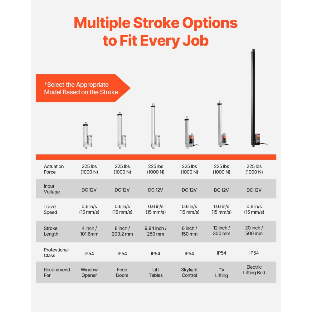 Αποδοτική ρύθμιση διαδρομής: Με ταχύτητα 0,6 ίντσες/δευτερόλεπτο, ο γραμμικός ενεργοποιητής VEVOR 12V είναι ιδανικός για συχνές ρυθμίσεις ύψους. Χειρίζεται αποτελεσματικά τις καθημερινές εργασίες αυτοματισμού, είτε πρόκειται για ρύθμιση του ύψους των επίπλων, ανύψωση και κατέβασμα του γραφείου, είτε για άνοιγμα παραθύρων αυτοκινήτου. Ισχυρή και σταθερή ροπή: Η σταθερή ροπή εξόδου 225 λίβρες (1000N) υπερέχει σε ελαφριά βιομηχανική και οικιακή χρήση, όπως καναπέδες μασάζ, ανακλινόμενες πολυθρόνες, ανυψωτήρες τηλεοράσεων, τραπέζια ανύψωσης, ηλεκτρικά αναπηρικά αμαξίδια, ηλεκτρικά ανοίγματα παραθύρων και άλλα συστήματα αυτοματισμού. Ομαλή και σταθερή λειτουργία για εφαρμογές χαμηλού φορτίου και μεγάλης διάρκειας. Αθόρυβη λειτουργία για άνεση: Λειτουργώντας με λιγότερο από 50 dB (θόρυβος χωρίς φορτίο), ο γραμμικός ενεργοποιητής 12V μας είναι η επιλογή σας για υπνοδωμάτια, γραφεία, νοσοκομεία και εργαστήρια όπου η ησυχία έχει σημασία. Απολαύστε αποτελεσματική και αξιόπιστη απόδοση χωρίς να διαταράσσετε το περιβάλλον σας. Βαθμός προστασίας IP54: Ο βαθμός προστασίας IP54 και το ανθεκτικό περίβλημα από κράμα αλουμινίου προσφέρουν εκτεταμένη διάρκεια ζωής σε εσωτερικούς χώρους. (Προσοχή: Για σταθερή απόδοση και μεγαλύτερη διάρκεια ζωής, αποφύγετε τη χρήση σε εξωτερικούς χώρους και αποτρέψτε την είσοδο νερού στον κινητήρα, η οποία μπορεί να προκαλέσει καύση.) Βασικές προδιαγραφές: Ταχύτητα κίνησης: 0,6"/s (15 mm/s). Μήκος διαδρομής: 8" (203,2 mm). Εκτεταμένο μήκος: 20" (508 mm). Μήκος σε σύμπτυξη: 12" (304,8 mm). Κατανάλωση ρεύματος: 5 Amps. Τάση εισόδου: DC 12V. Κύκλος λειτουργίας: 25%