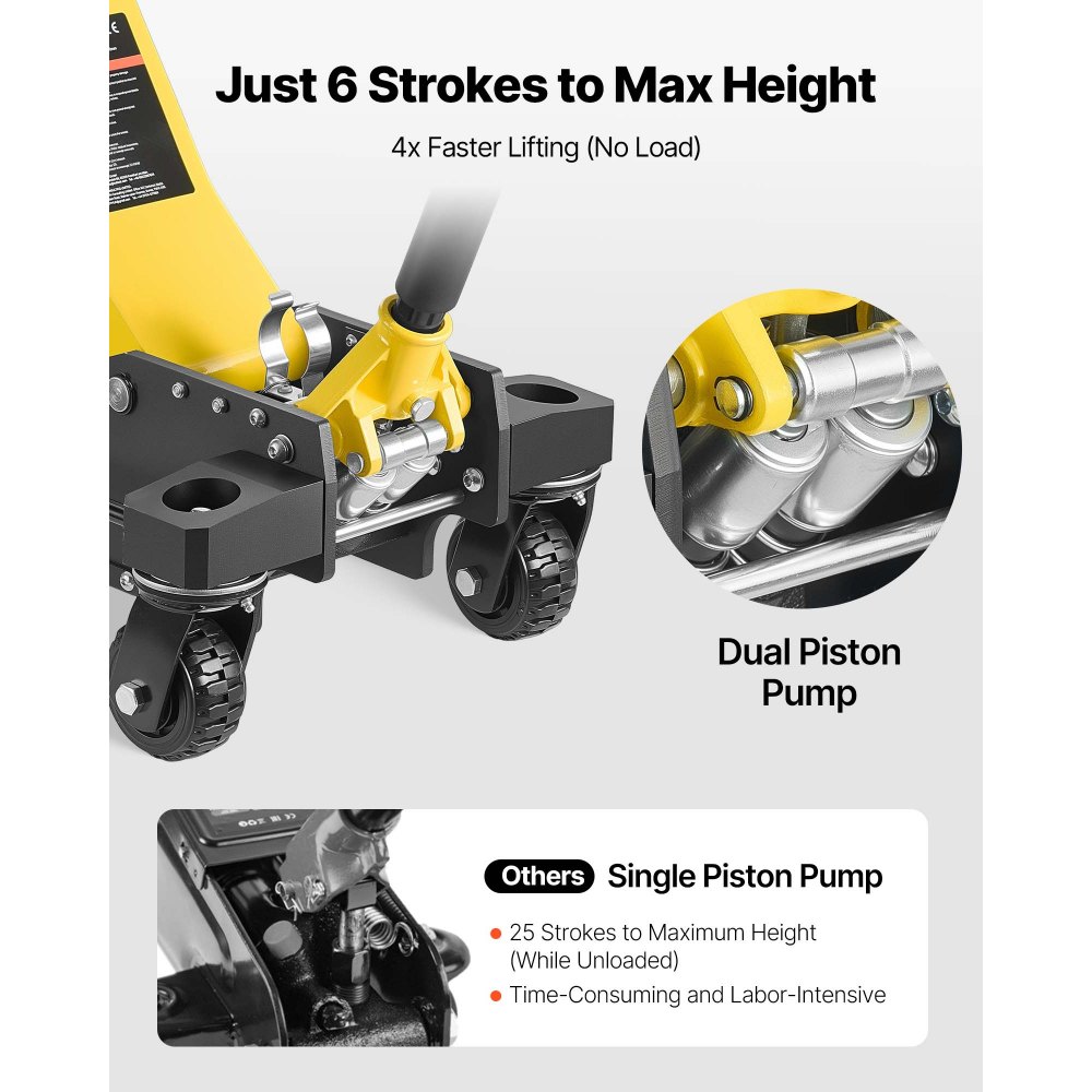 Στύλοι επέκτασης ανύψωσης: Αυτός ο γρύλος δαπέδου έχει σχεδιαστεί για την ανύψωση οχημάτων εκτός δρόμου. Ανυψώνει από 5,9–23,2 ίντσες (150–590 mm). Με εγκατεστημένο τον στύλο επέκτασης, το μέγιστο ύψος φτάνει τα 29,3 ίντσες (745 mm) για οχήματα εκτός δρόμου και άλλα οχήματα υψηλής απόστασης. Ρόδες μεγάλης διαμέτρου: Ο υδραυλικός γρύλος δαπέδου εκτός δρόμου διαθέτει τέσσερις ροδάκια μεγάλης διαμέτρου. Κυλάει ομαλά σε ανώμαλους δρόμους με πλάκες και χωματόδρομους. Το βαθύ πέλμα βελτιώνει την πρόσφυση, ενώ η πλάκα βάσης βοηθά στη μείωση της βύθισης κατά την ανύψωση σε εξωτερικούς χώρους. Μέγιστη χωρητικότητα 3T: Ο γρύλος δαπέδου υψηλής ανύψωσης υποστηρίζει έως και 3 τόνους (6.614 λίβρες). Ανυψώνει οχήματα εκτός δρόμου, SUV, φορτηγά και φορτηγά. Ιδανικός για αλλαγές ελαστικών, σέρβις φρένων, εργασίες ανάρτησης και άλλες εργασίες στο κάτω μέρος του αμαξώματος. Χρησιμοποιήστε βάσεις γρύλου για μακροχρόνια υποστήριξη. Γρήγορη ανύψωση διπλού εμβόλου: Αυτός ο γρύλος υψηλής ανύψωσης χρησιμοποιεί σύστημα υδραυλικής αντλίας διπλού εμβόλου για ταχύτερη ανύψωση. Οι διπλοί κύλινδροι κατανέμουν το βάρος ομοιόμορφα. Ένα σφραγισμένο υδραυλικό σύστημα βοηθά στη μείωση των διαρροών και υποστηρίζει σταθερή ανύψωση με χαμηλότερο κίνδυνο υπερφόρτωσης. Ασφαλής και σταθερή στήριξη: Ο γρύλος αυτοκινήτου υψηλής ανύψωσης συνδυάζει χάλυβα βαρέως τύπου και αλουμίνιο για αντοχή. Η δομή βοηθά στη μείωση της ταλάντωσης κατά την ανύψωση. Μια περιστρεφόμενη σέλα με αντιολισθητικό ελαστικό μαξιλαράκι προστατεύει το κάτω μέρος του αμαξώματος και ευθυγραμμίζεται εύκολα με τα σημεία ανύψωσης.