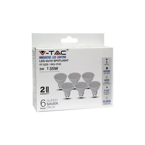 Διατίθεται σε πρακτική συσκευασία Box 6 τεμαχίων, προσφέροντας μια ολοκληρωμένη και οικονομική λύση για την άμεση αναβάθμιση πολλαπλών σημείων φωτισμού. Η βάση GU10 επιτρέπει την εύκολη τοποθέτηση σε όλα τα τυπικά σποτ οροφής (PAR16). Η κατασκευή από ανθεκτικό λευκό πλαστικό και η εγγύηση 2 ετών από τη V-TAC διασφαλίζουν την αξιοπιστία και την ασφάλεια της εγκατάστασής σας σε κάθε εσωτερικό χώρο (IP20).