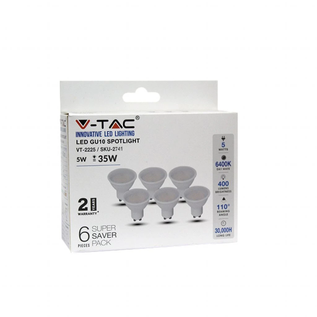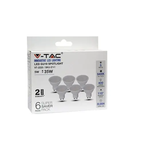 Διατίθεται σε πρακτική συσκευασία Box 6 τεμαχίων, προσφέροντας μια ολοκληρωμένη και οικονομική λύση για την άμεση αναβάθμιση πολλαπλών σημείων φωτισμού. Η βάση GU10 επιτρέπει την εύκολη τοποθέτηση σε όλα τα τυπικά σποτ οροφής (PAR16). Η κατασκευή από ανθεκτικό λευκό πλαστικό και η εγγύηση 2 ετών από τη V-TAC διασφαλίζουν την αξιοπιστία και την ασφάλεια της εγκατάστασής σας σε κάθε εσωτερικό χώρο (IP20).