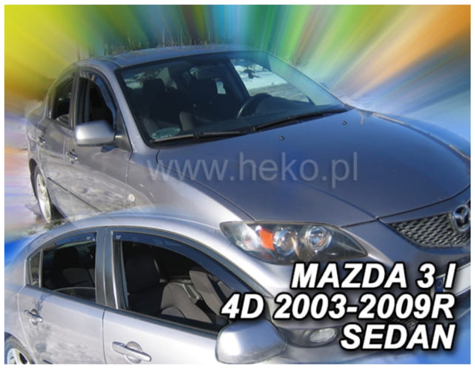 MAZDA 3 4D 08/2003-2009 ΣΕΤ ΑΝΕΜΟΘΡΑΥΣΤΕΣ ΑΥΤΟΚΙΝΗΤΟΥ ΑΠΟ ΕΥΚΑΜΠΤΟ ΦΙΜΕ ΠΛΑΣΤΙΚΟ HEKO - 4 ΤΕΜ. Ανεμοθραύστες παραθύρων αεροδυναμικού σχεδιασμού από την εταιρία HEKO, πολωνικής προέλευσης, κατασκευασμένοι από ειδικό πλαστικό υψηλής ποιότητας και εξαιρετικής αντοχής σε σκούρο φιμέ, κατάλληλοι για τις μπροστά και τις πίσω πόρτες του οχήματός σας. Χάρις στην πολύ λεπτή βάση τους, τοποθετούνται κολλητοί/χωνευτοί μέσα στην υποδοχή του τζαμιού (τσιμούχα παραθύρου) με κλιπς ή ταινία διπλής όψης (περιλαμβάνονται στη συσκευασία), χωρίς να επηρεάζουν καθόλου την εύρυθμη λειτουργία του τζαμιου, τον μηχανισμό του παραθύρου ή τις αντιηλιακές μεμβράνες σας (φιλμ παραθύρων).